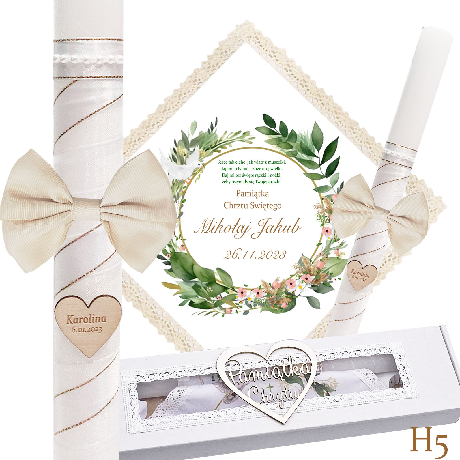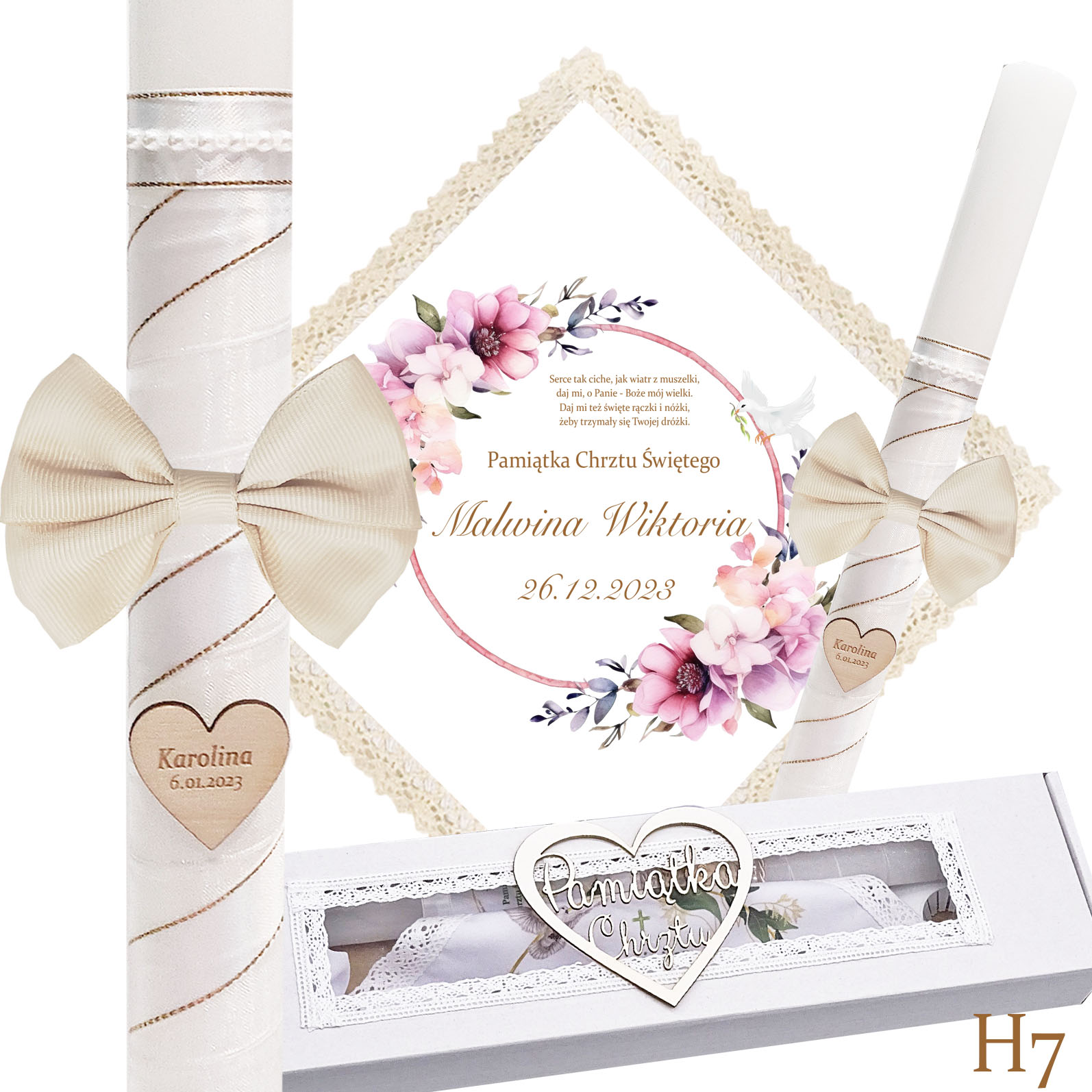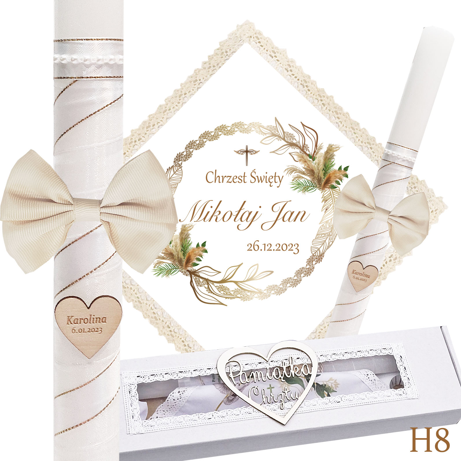 Наша хрестильна свічка — це не лише джерело світла, а й теж красива прикраса. Він обмотаний білою шифоновою стрічкою та білою атласною стрічкою із золотою ниткою, на ній гарний бантик. Також на свічці є серце з ім'ям дитини та, за бажанням, датою хрещення.