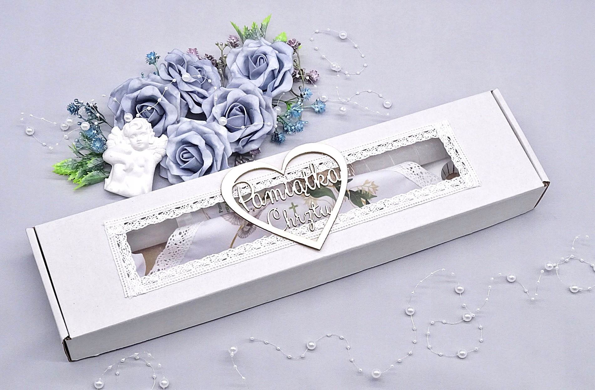 Біла коробка для хрестильної ряси та свічки – ідеальне рішення для людей, які шукають екологічну упаковку. Виготовлена з білого картону, коробка має 3D напис «Сувенір на Святе Хрещення» на кришці, що надає їй елегантного вигляду.