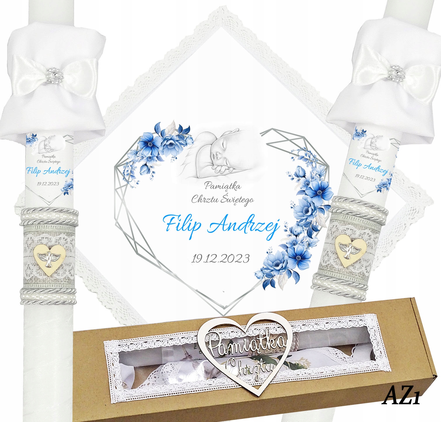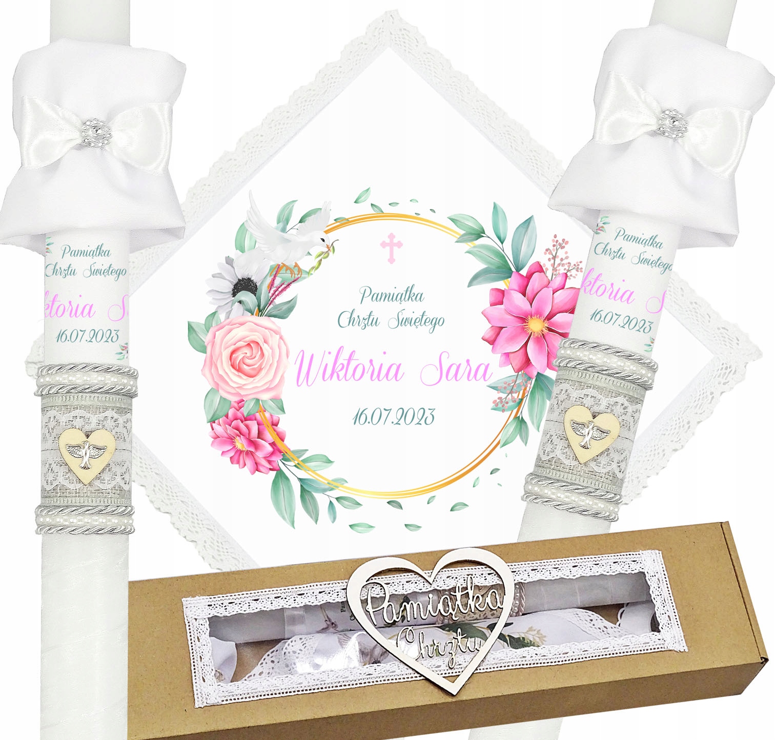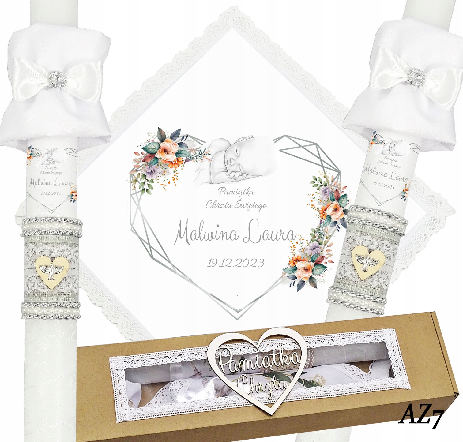 Представляємо надзвичайний набір хрестинних риз та свічок, створених з урочистим подія в житті кожної дитини. Халат виготовлений з білосніжного матеріалу та оброблений бавовняним мереживом, що надає йому елегантності та ніжності. Свічка декорована вручну і має принт з ім'ям дитини, що робить її унікальним і унікальним сувеніром. Свічка має срібну нитку, на її поверхні сіра джутова стрічка з мереживом і дерев'яне серце з срібним символом Святого Духа. Інша частина свічки обмотується білою шифоновою стрічкою.