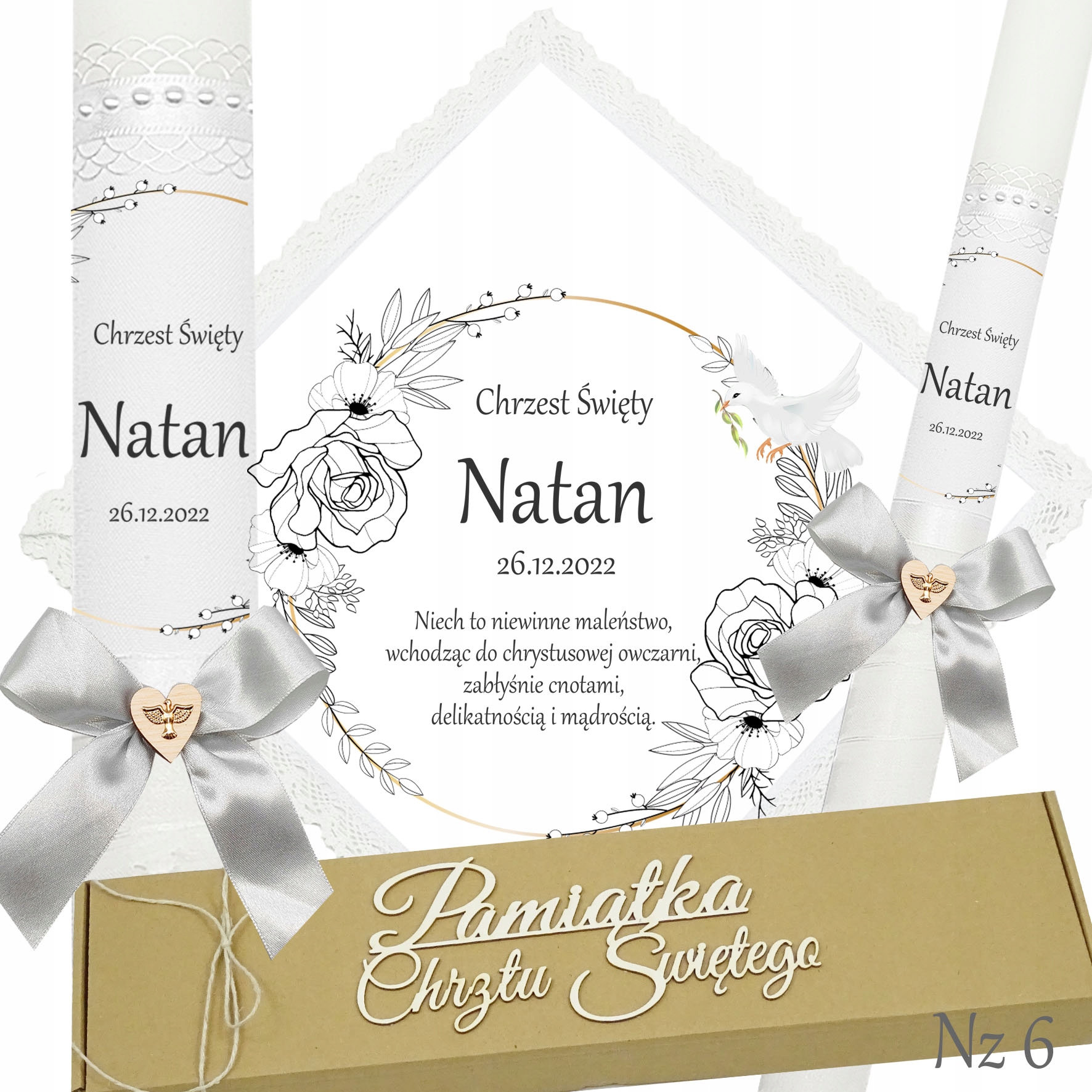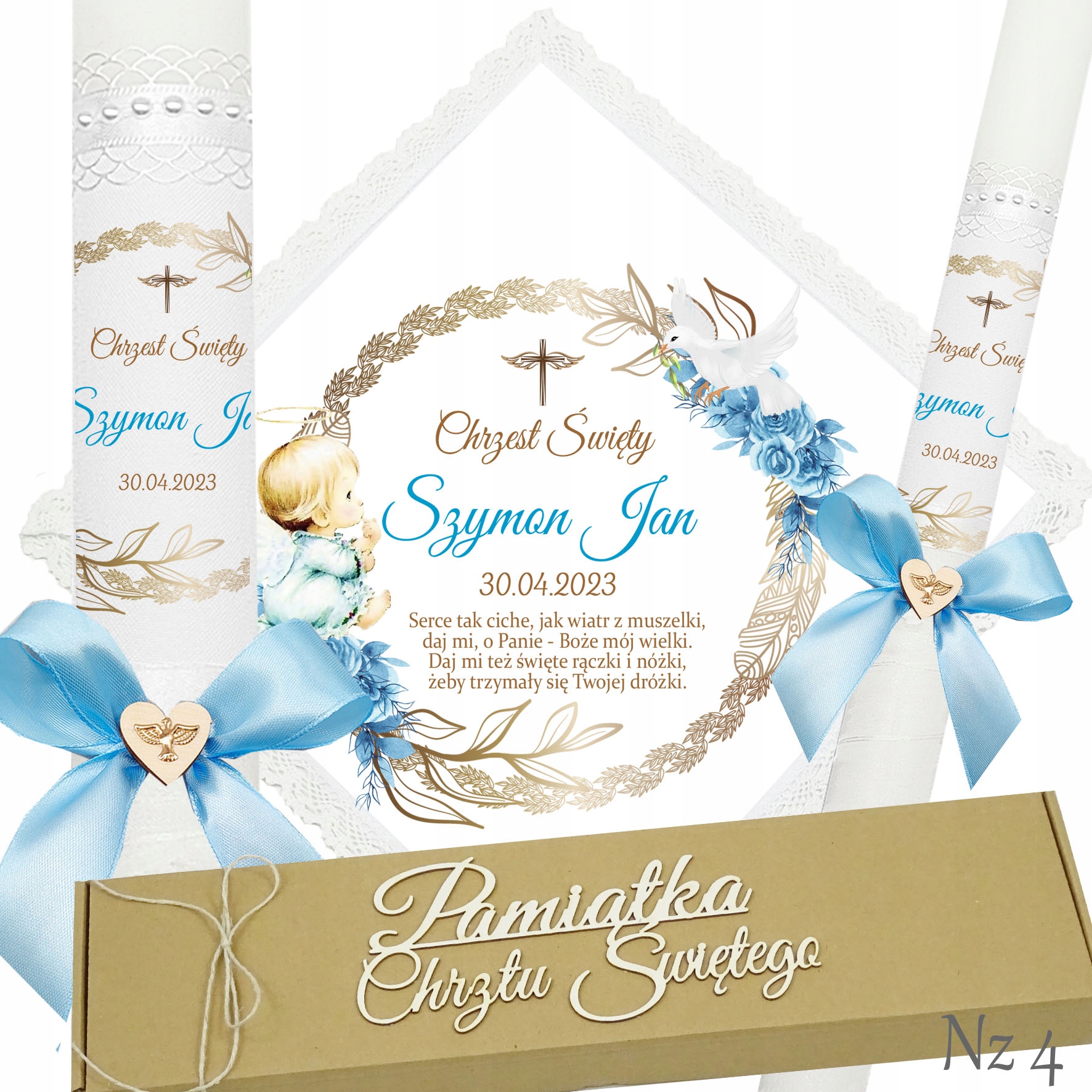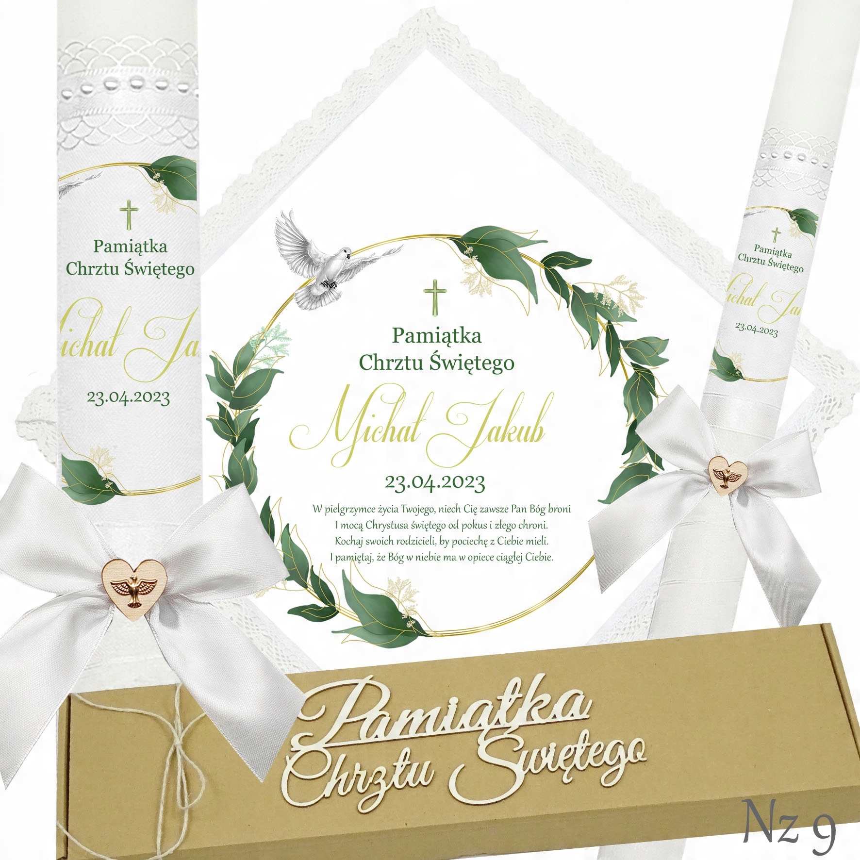 Представляємо надзвичайний набір для хрещення, який складається з ризи та свічки, це ідеальний вибір для батьків, які хочуть відсвяткувати цей особливий день елегантно та незабутньо. Свічка прикрашена білою шифоновою стрічкою, що додає їй неповторний характер і шарм. Верх свічки прикрашений атласним мереживом і білими перлами, що надає їй елегантності та шику. Лук з дерев'яним серцем і металевою золотою емблемою Святого Духа. додає чарівного та сентиментального акценту.Все це упаковано в картонну еко-коробку з 3D написом «Сувенір на Святе Хрещення».Цей унікальний набір з ризи та свічки неодмінно підкреслить церемонію хрещення та посилить емоції та спогади, пов'язані з цим особливий випадок. p>