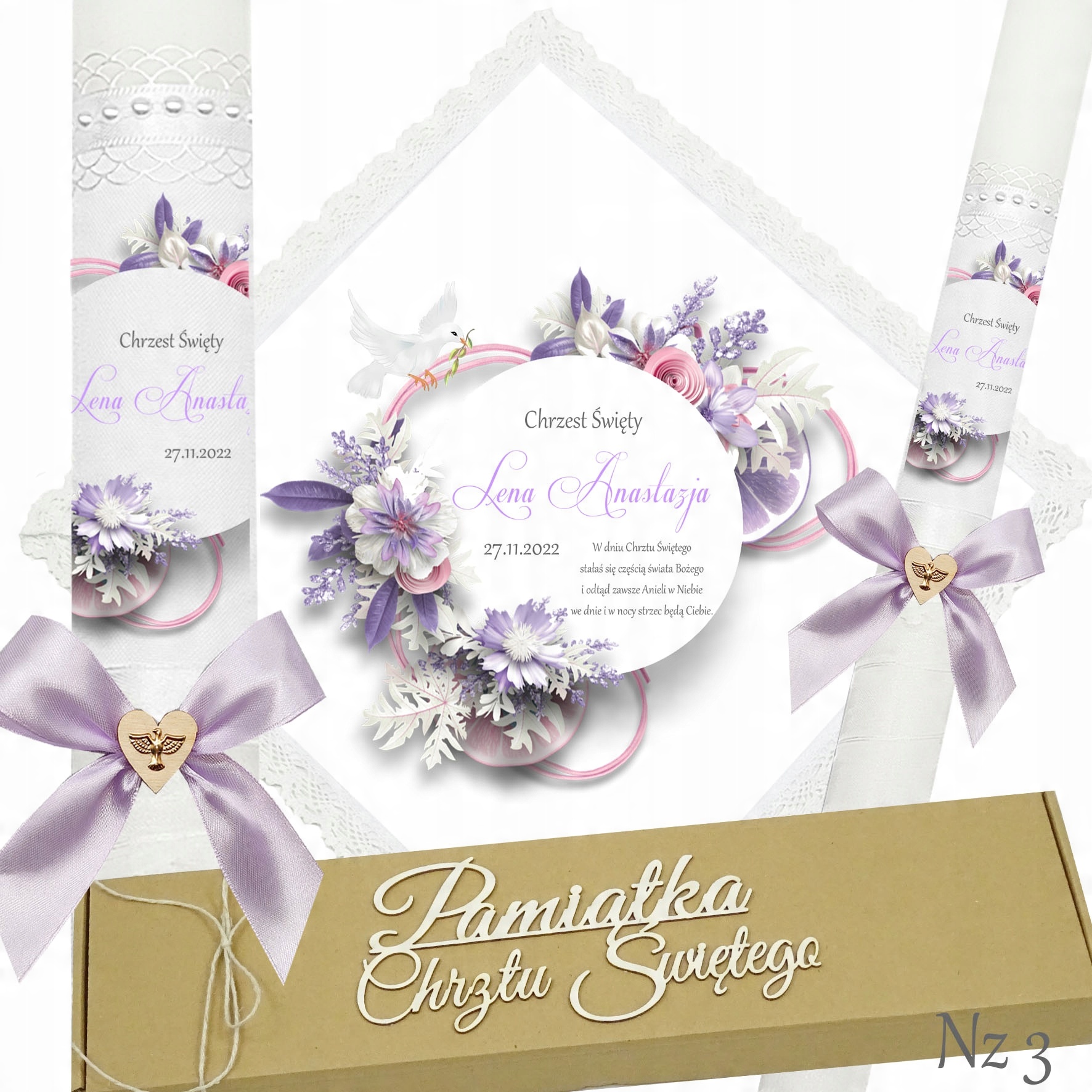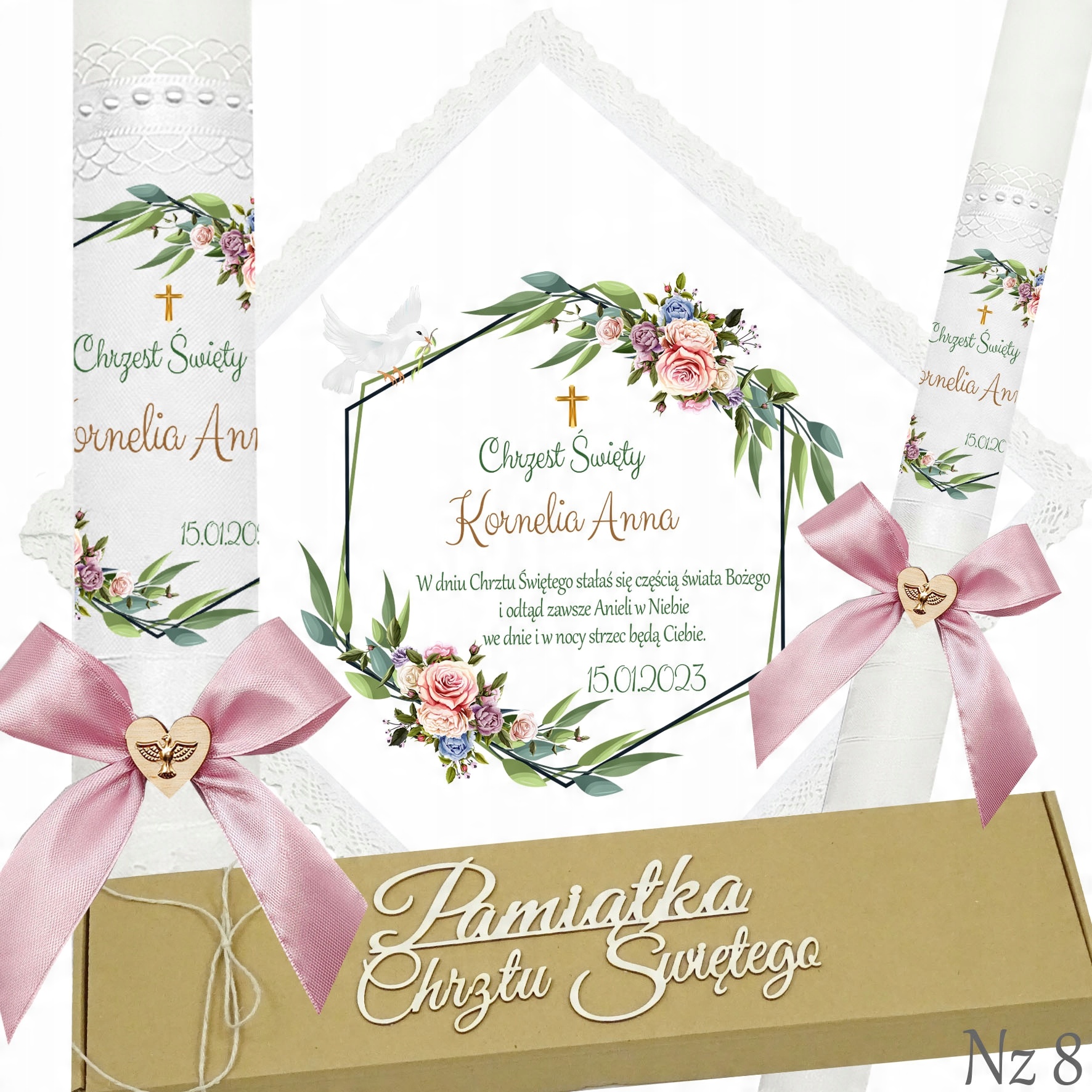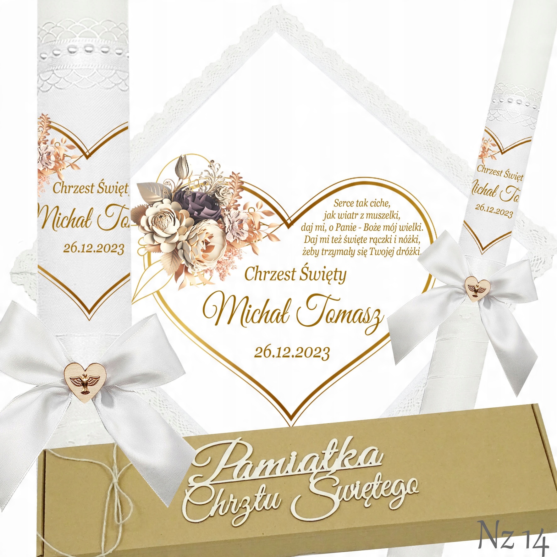 Представляємо надзвичайний набір для хрещення, який складається з ризи та свічки, це ідеальний вибір для батьків, які хочуть відсвяткувати цей особливий день елегантно та незабутньо. Свічка прикрашена білою шифоновою стрічкою, що додає їй неповторний характер і шарм. Верх свічки прикрашений атласним мереживом і білими перлами, що надає їй елегантності та шику. Лук з дерев'яним серцем і металевою золотою емблемою Святого Духа. додає чарівного та сентиментального акценту.Все це упаковано в картонну еко-коробку з 3D написом «Сувенір на Святе Хрещення».Цей унікальний набір з ризи та свічки неодмінно підкреслить церемонію хрещення та посилить емоції та спогади, пов'язані з цим особливий випадок. p>