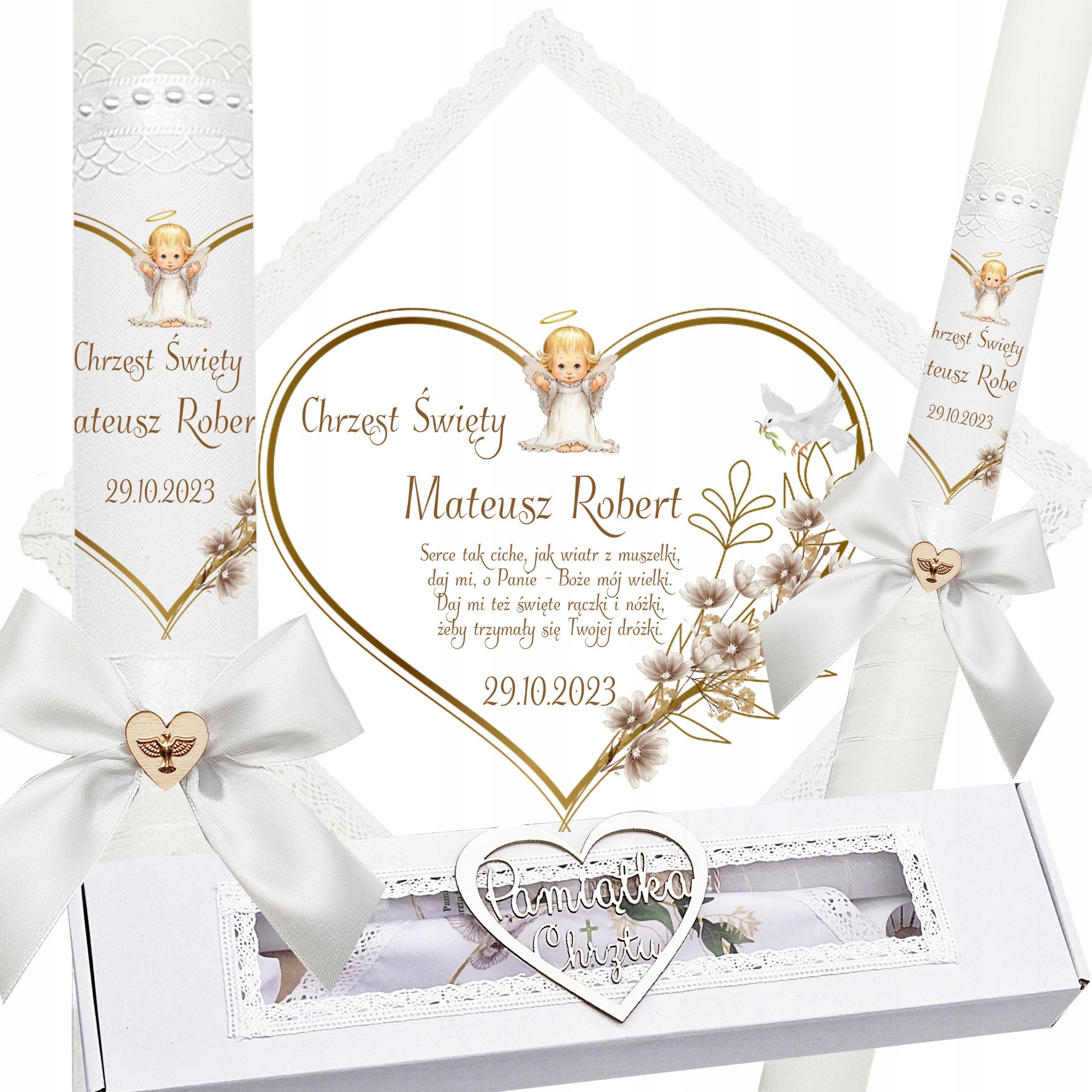 Представляємо надзвичайний набір для хрещення, що складається з ризи та свічки, ідеальний вибір для батьків які хочуть відсвяткувати цей особливий день елегантно та незабутньо. Свічка прикрашена білою шифоновою стрічкою, що додає їй неповторний характер і шарм. Верх свічки прикрашений атласним мереживом і білими перлами, що надає їй елегантності та шику. Лук з дерев'яним серцем і металевою золотою емблемою Святого Духа. додає чарівності та сентиментальності. Все було запаковано в декоративну коробку, яка дозволяє зберігати ці незвичайні сувеніри.