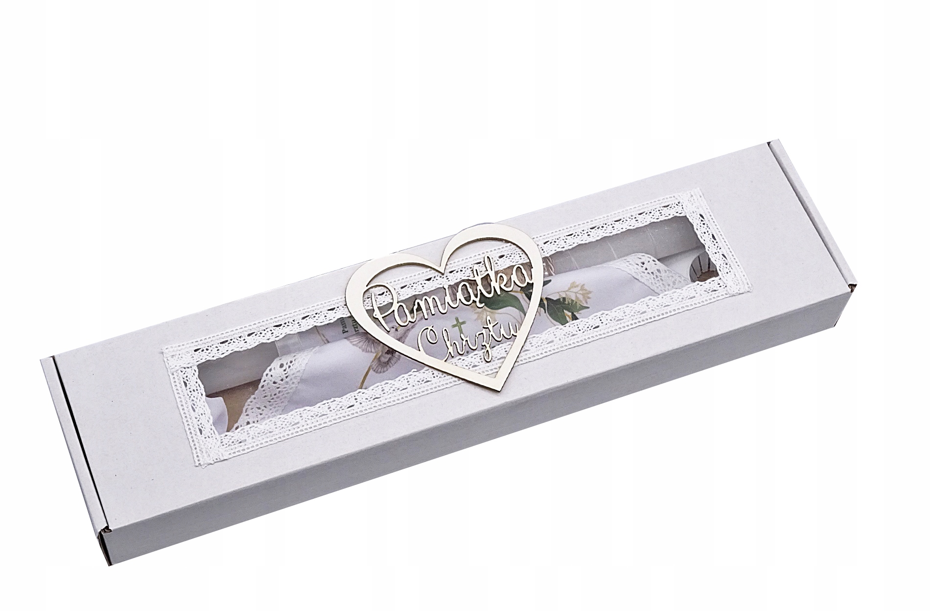 Біла картонна коробка для хрестильної ряси та свічки з віконцем, прикрашена бавовняним мереживом та 3D напис у формі серця. Ця елегантна та витончена упаковка чудово виглядатиме як сувенір.