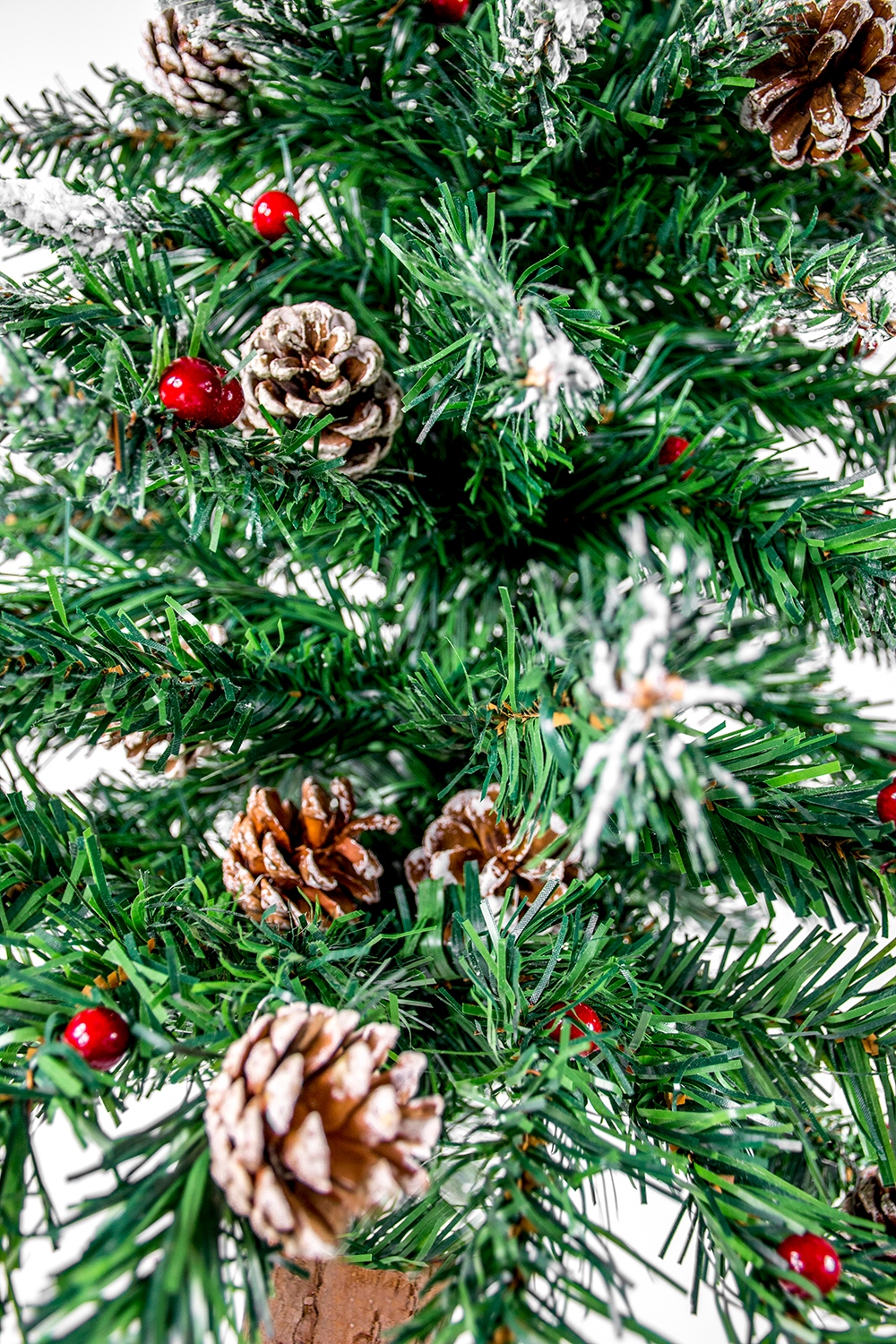 Ніжно, але водночас стійкі гілки, багаті засніженою хвоєю, дозволять вам виставити свої ялинкові прикраси, якщо вони вам знадобляться - разом з ялинкою ви отримуєте набір шишок сосни та червоної горобини .