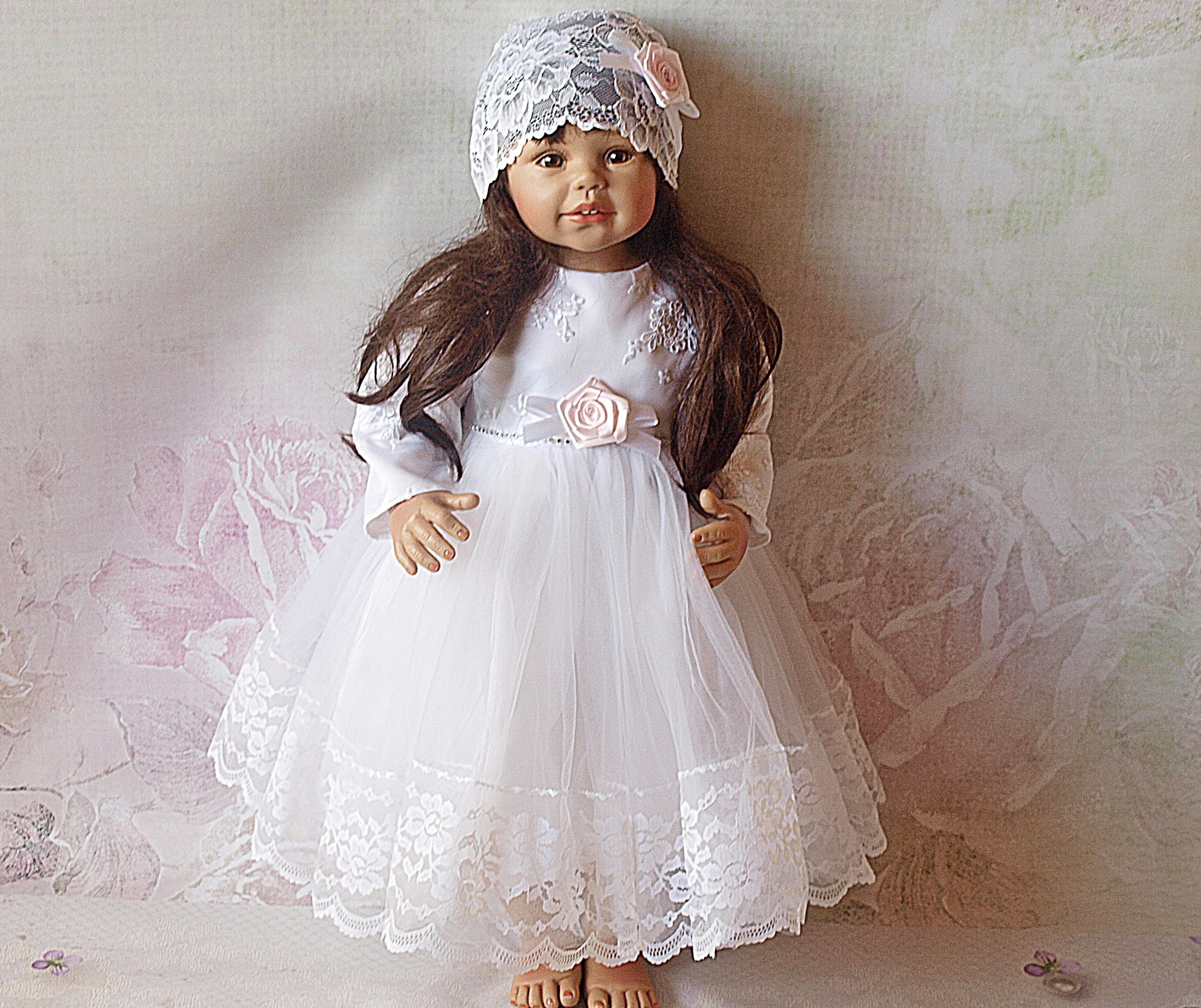 Чудове плаття повністю виконане з білого атласу, ніжного мережива та тюлю. Пояс прикрашений смужкою зі страз і білим бантом з рожевою трояндою. Для комфорту дитини внутрішня частина корсета обшита м'якою бавовною. Низ сукні виготовлений з атласу та дуже щільно зібраного тюлю, обробленого мереживом, яке дуже гарно драпірується та робить сукню легкою та ніжною. Сукня досягає середини ікри, а довга блискавка дозволяє комфортно одягати дитину. У комплект входить мереживна шапочка. Набір виглядає чудово.