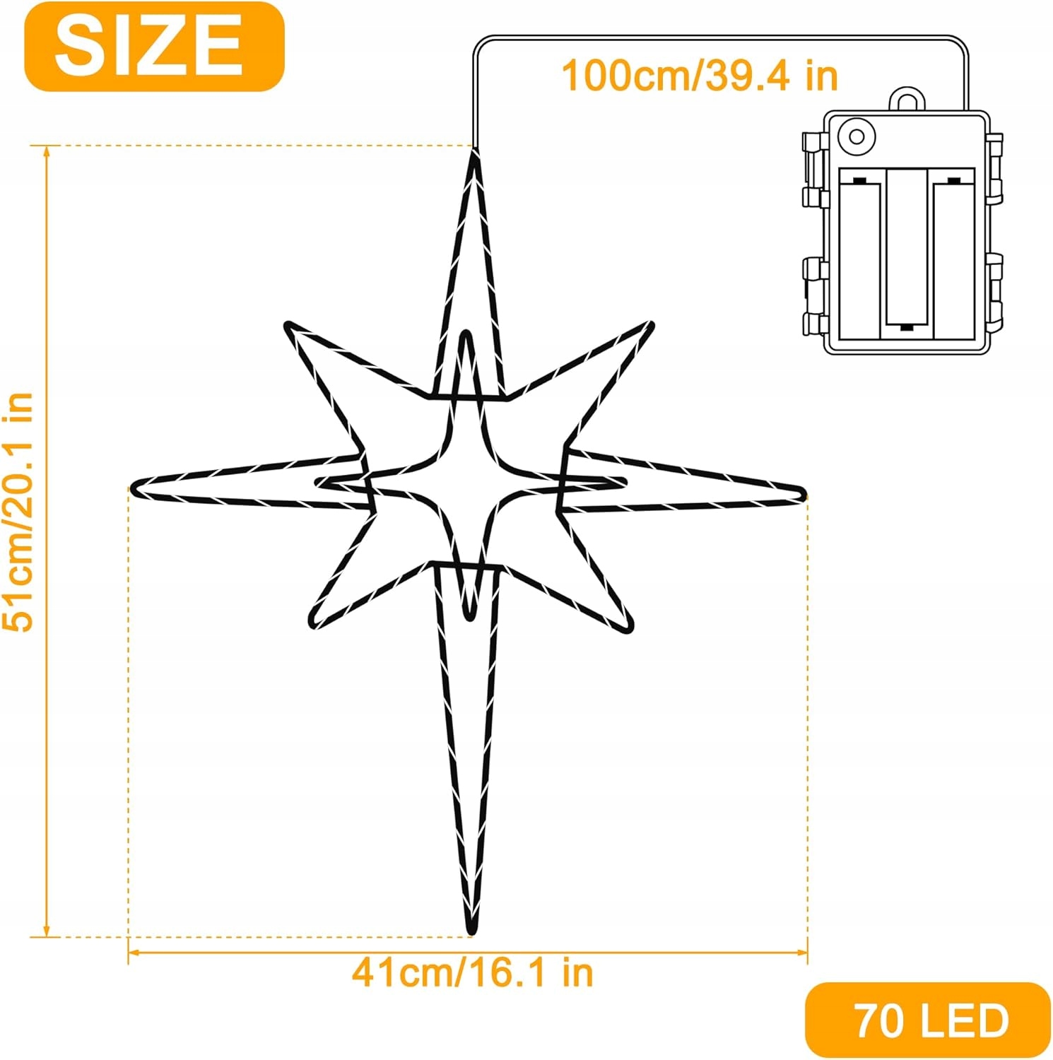 - Металева зірка з освітленням: 70 світлодіод/шматок, розміри: 51 см х 41 см, силовий кабель: 1 м, дія: 3 батареї АА, світиться у формі зірка Віфлеєм на металевій рамі