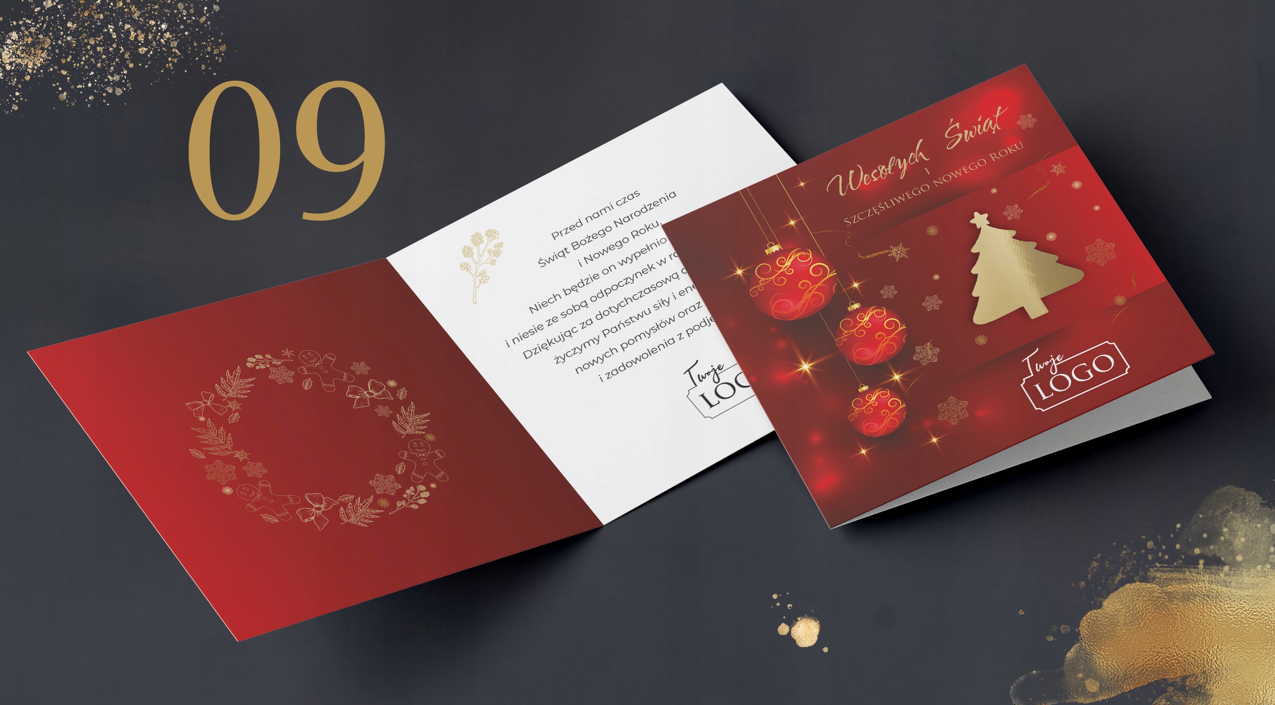 Складені різдвяні листівки з логотипом вашої компанії надруковані на перламутровому папері 250 г , кольор : кістка ілюгори). Яскраві кольори. цифровий друк на професійній виробничій машині xerox.