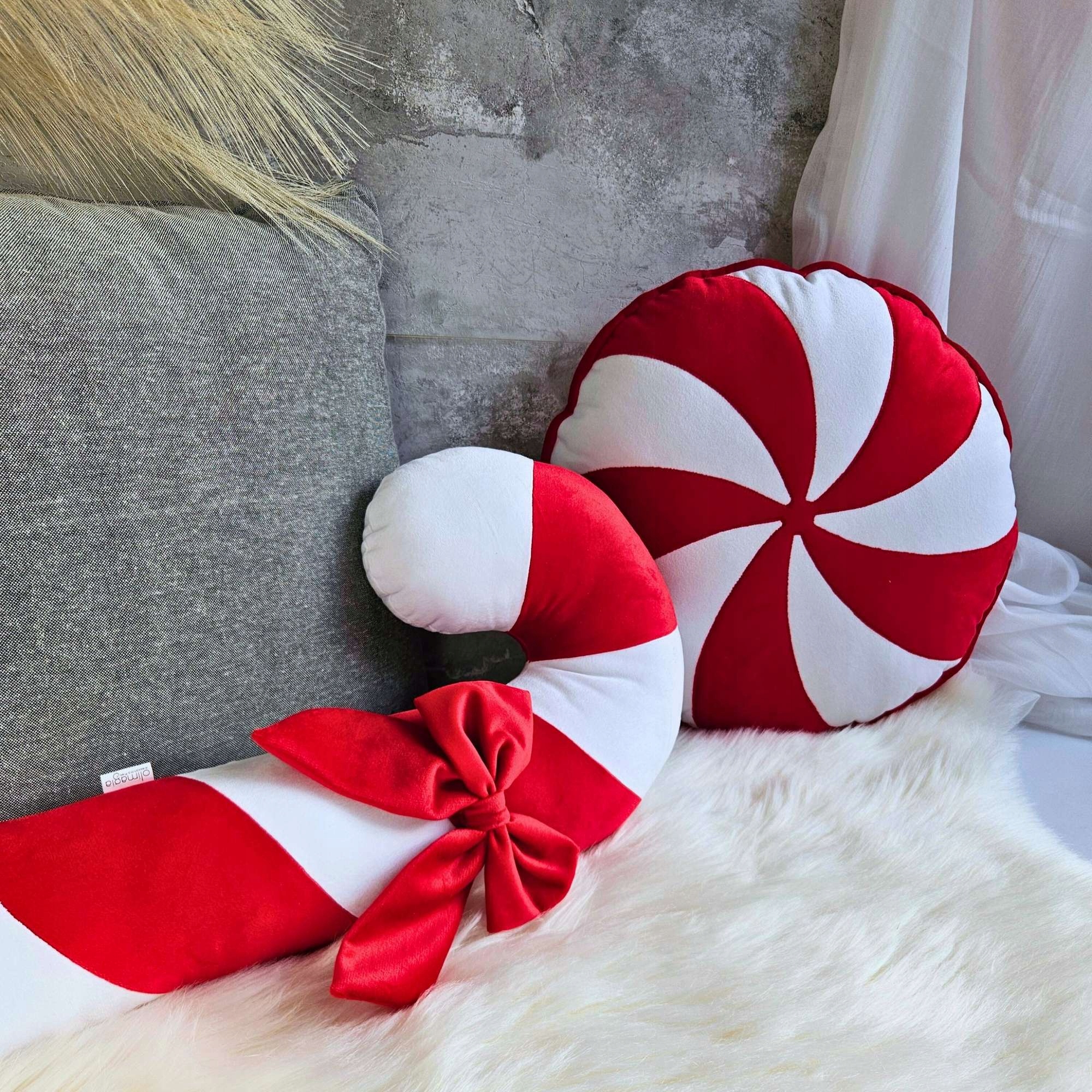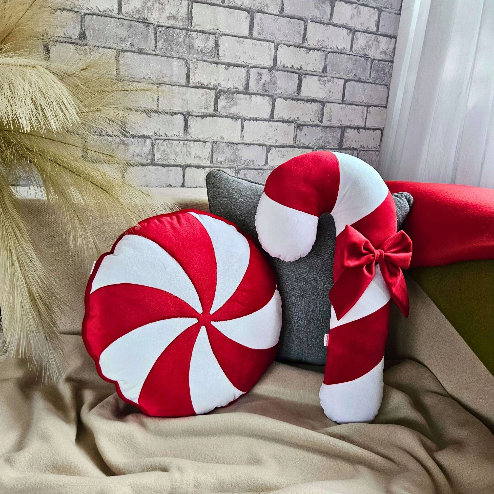 Цей унікальний набір різдвяних подушок складається з двох пошитих вручну прикрас: круглої подушечки з м’ятними цукерками та подушки у формі цукеркової тростини – льодяника.