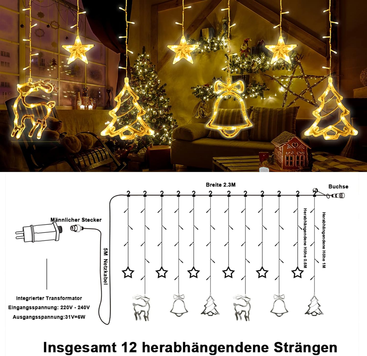1:Світловий ланцюг складається з 138 світлодіодів, розташованих на 12 ланцюжках. Різдвяна прикраса має 4 різні візерунки: зірки, олені, ялинки та дзвіночки.