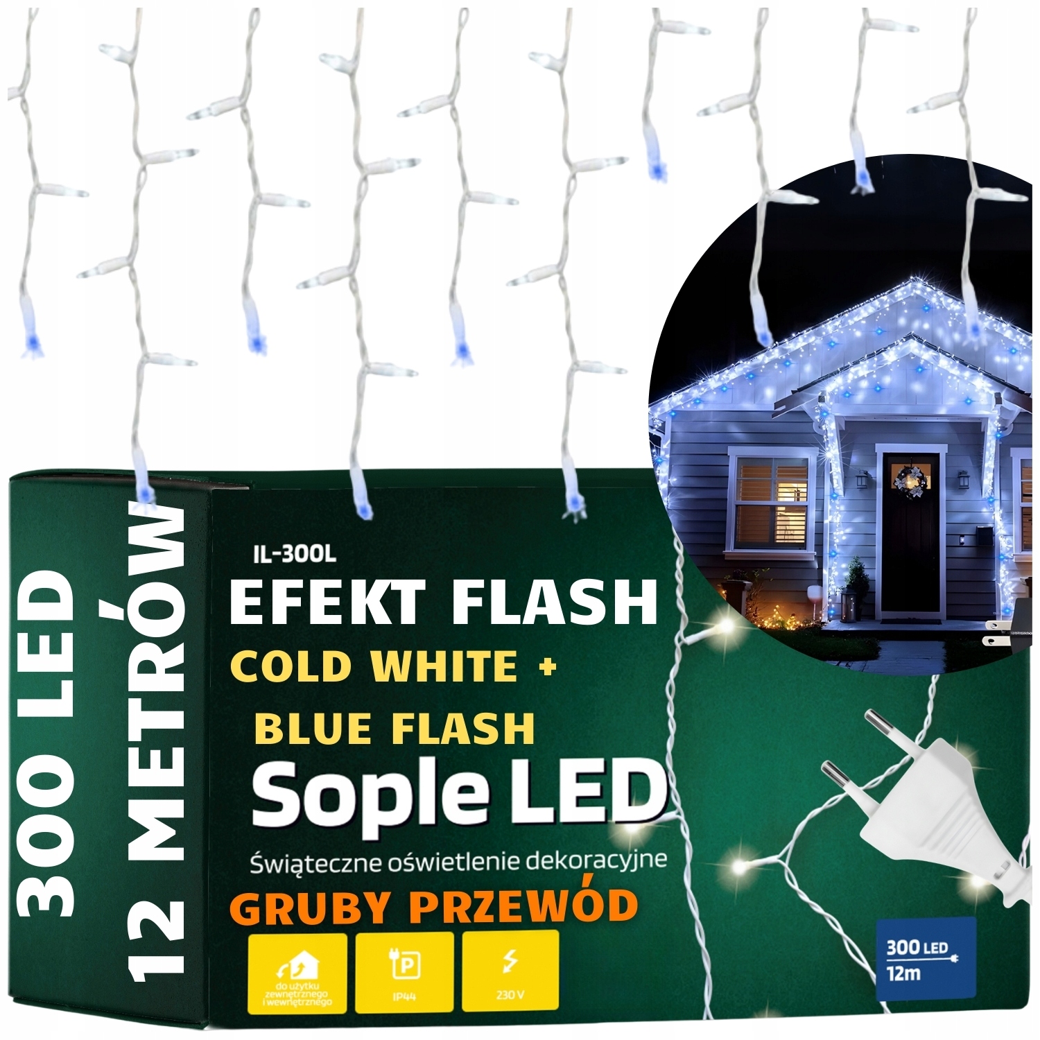 ✨✨ РІЗДВЯНІ СВІТЛІ ЗОВНІШНІ ІСИЛІ ДЛЯ БУДИНКУ БАЛКОН САД IP 44 300 LED МІЦНІ ТОВЩІ КАБЕЛІ 12 М ХОЛОДНИЙ БІЛИЙ + СИНІЙ ЕФЕКТ СПАЛАХУ