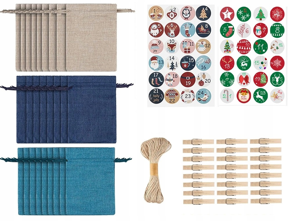 Підвісні адвент-мішечки — ідеальний спосіб відсвяткувати цю особливу подію року разом. Де повісити цей оригінальний адвент-календар, вирішувати вам. Це може бути чудовою прикрасою для ялинки, а також для каміна. У кімнаті вашої дитини ви можете повісити їх де завгодно за допомогою мотузки та двох наборів наклейок. Цей набір складається з джутових пакетів у 3 кольорах і пронумерованих наклейок, тож він чудово доповнить цю особливу пору року.