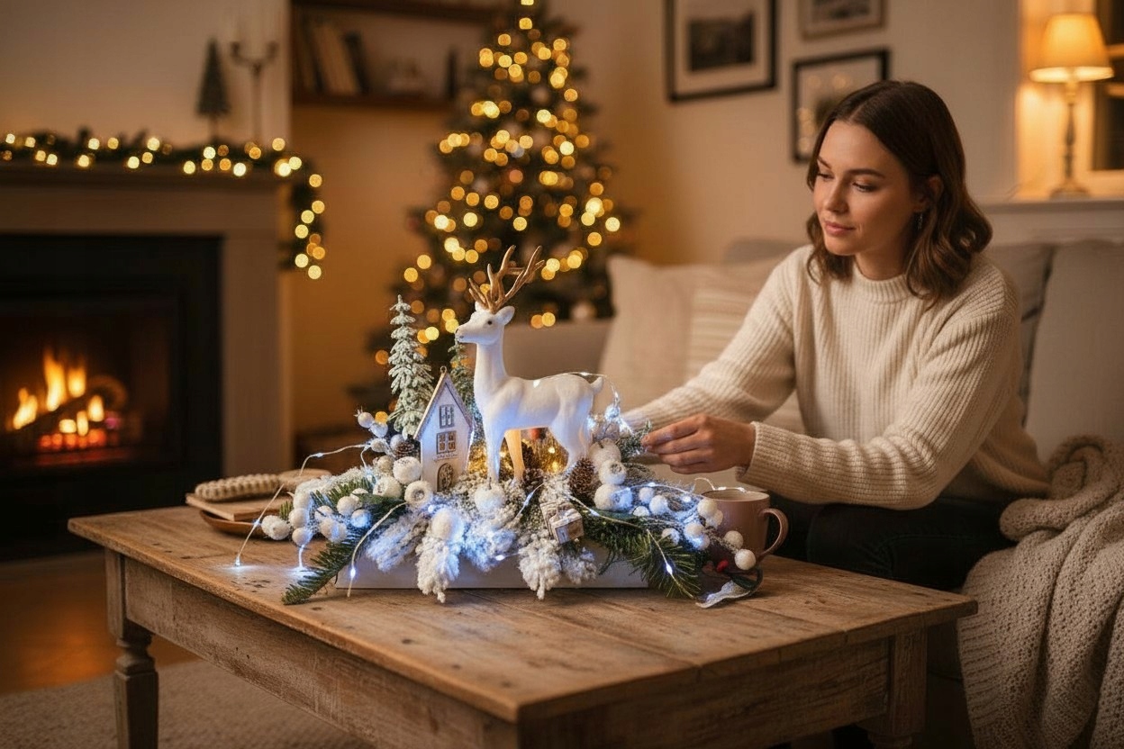 Чудова зимова прикраса у вигляді різдвяного декору з оленями та засніженими елементами в поєднанні з ніжними світлодіодними ліхтарями на білій основі надає всьому об’єкту елегантний, розкішний вигляд. Ідеально підходить як прикраса для столу, комода, вітрини, стійки реєстрації або святкової виставки.
