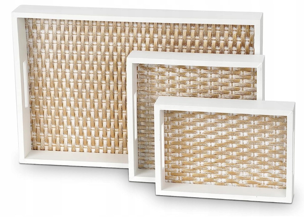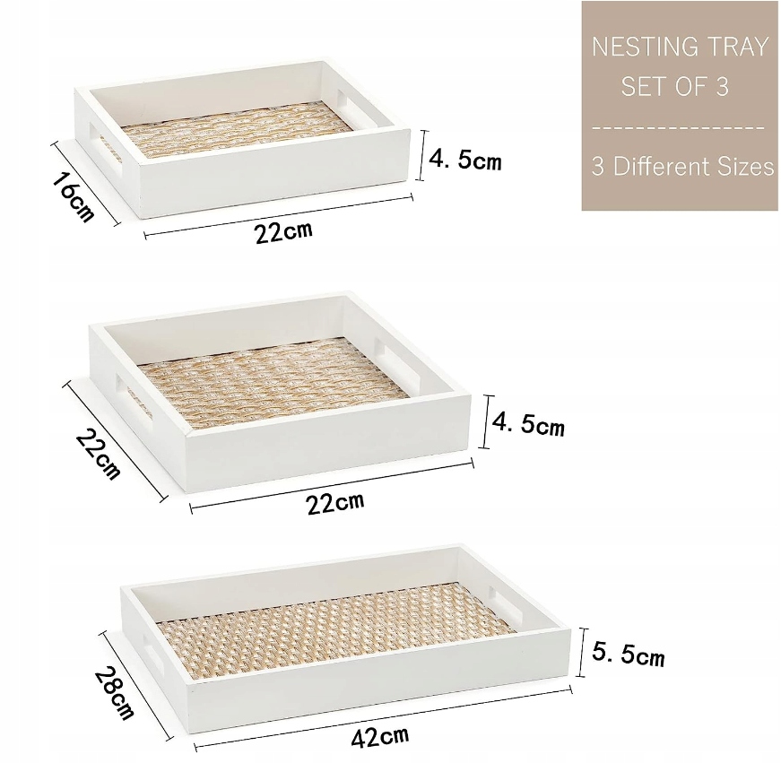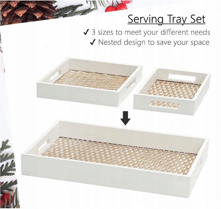- 【Стильний сервісний планшет】Вигляд білого дерева та плетеного ротанга створює захоплюючий вінтажний дизайн. У цьому наборі з 3 предметів із деревини в рустикальному стилі ви можете зберігати, прикрашати та впорядковувати майже будь-що, поєднуючи високоякісний дизайн із високою функціональністю!