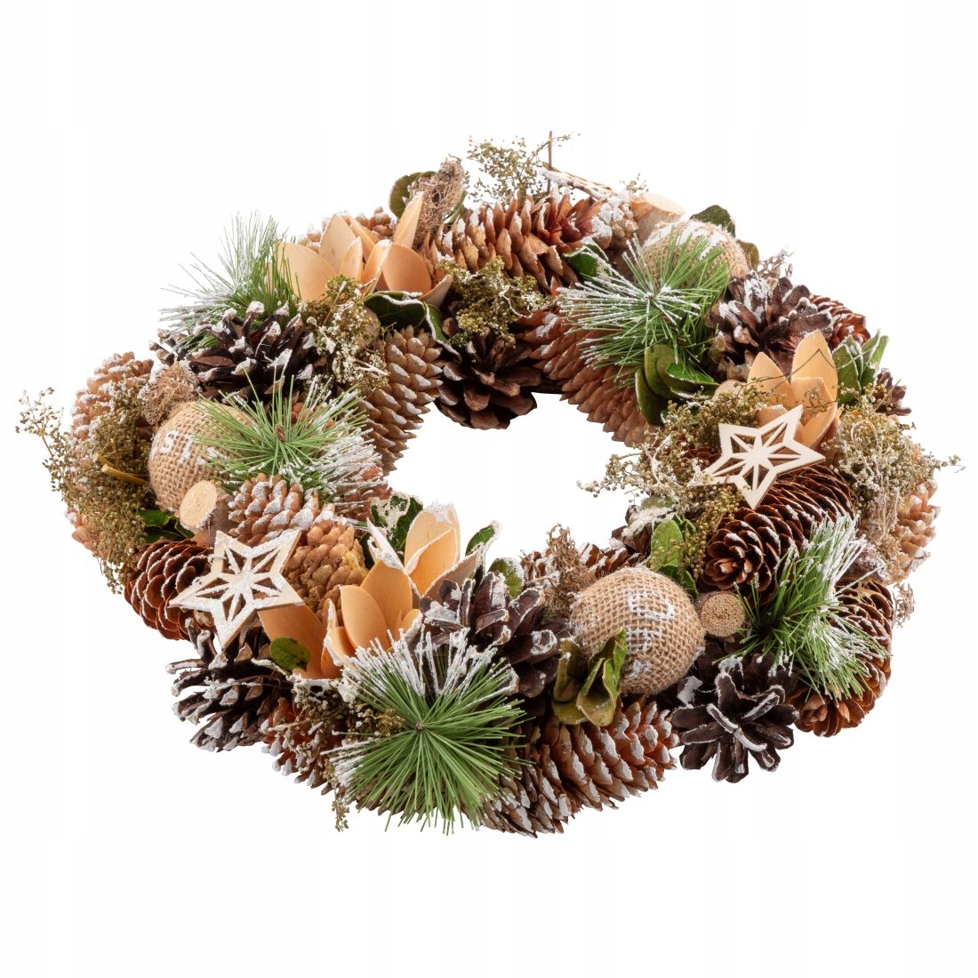 Цей вінок — квінтесенція різдвяного тепла та природного шарму. Його зимові прикраси – оповиті білими шишками, джутові фенечки та дерев’яні зірочки створюють композицію, яка принесе у ваш дім спокій і затишок зимового лісу. Ідеально підходить для того, щоб повісити на двері, де вже з порога зустрічатиме гостей чарівною аурою Різдва. Це прикраса, яка підкреслить неповторність сімейних моментів і додасть вашому дому неповторної атмосфери.