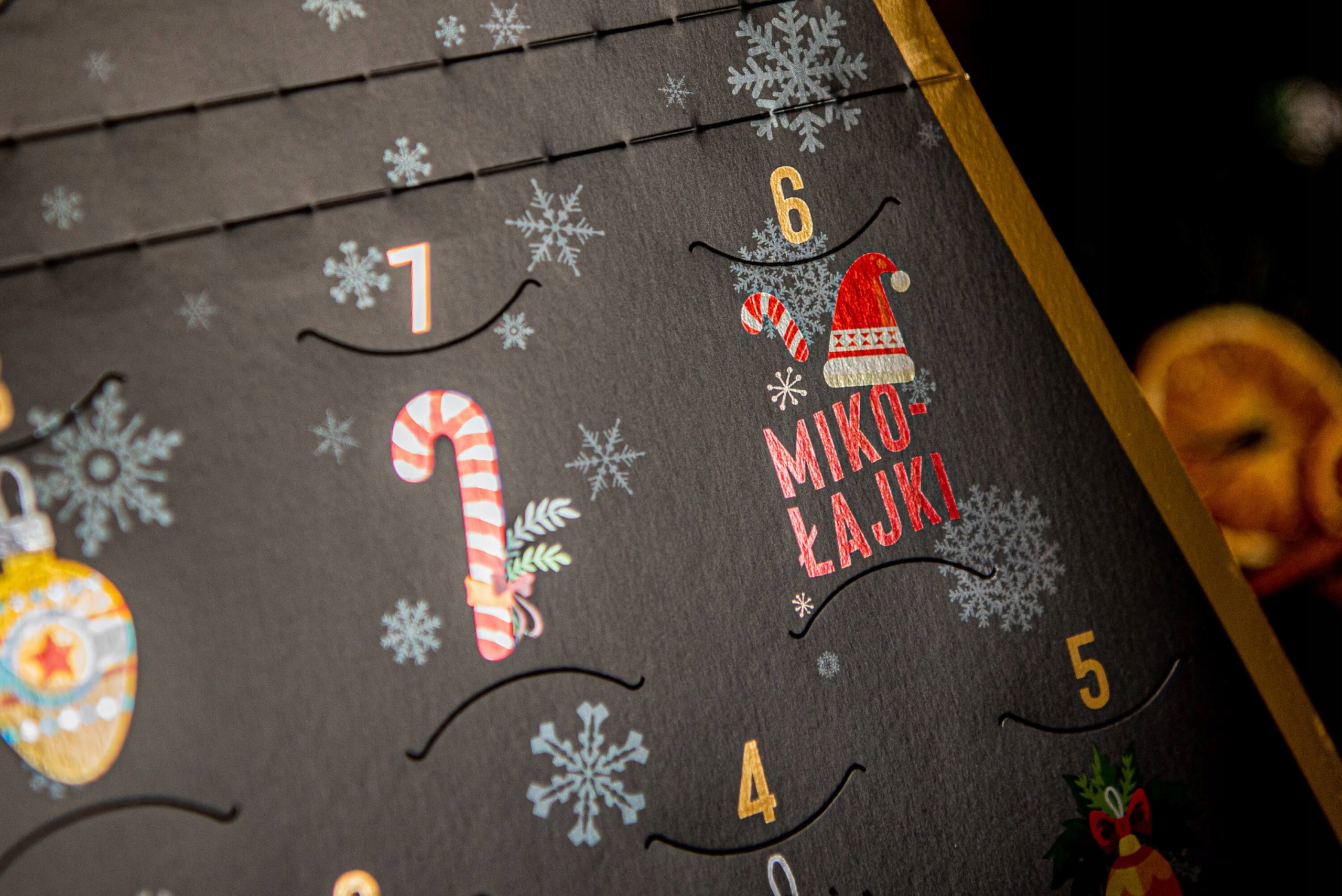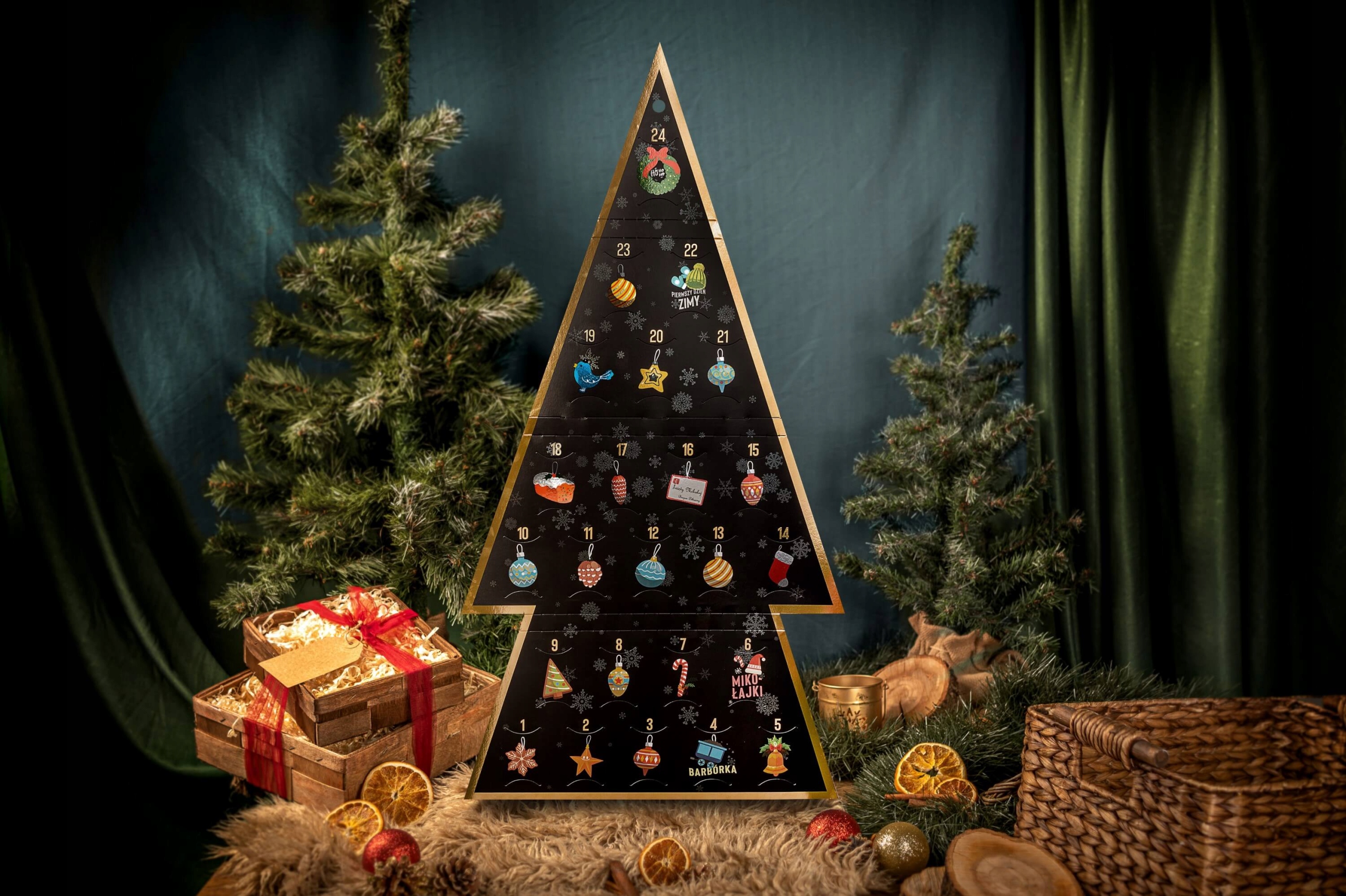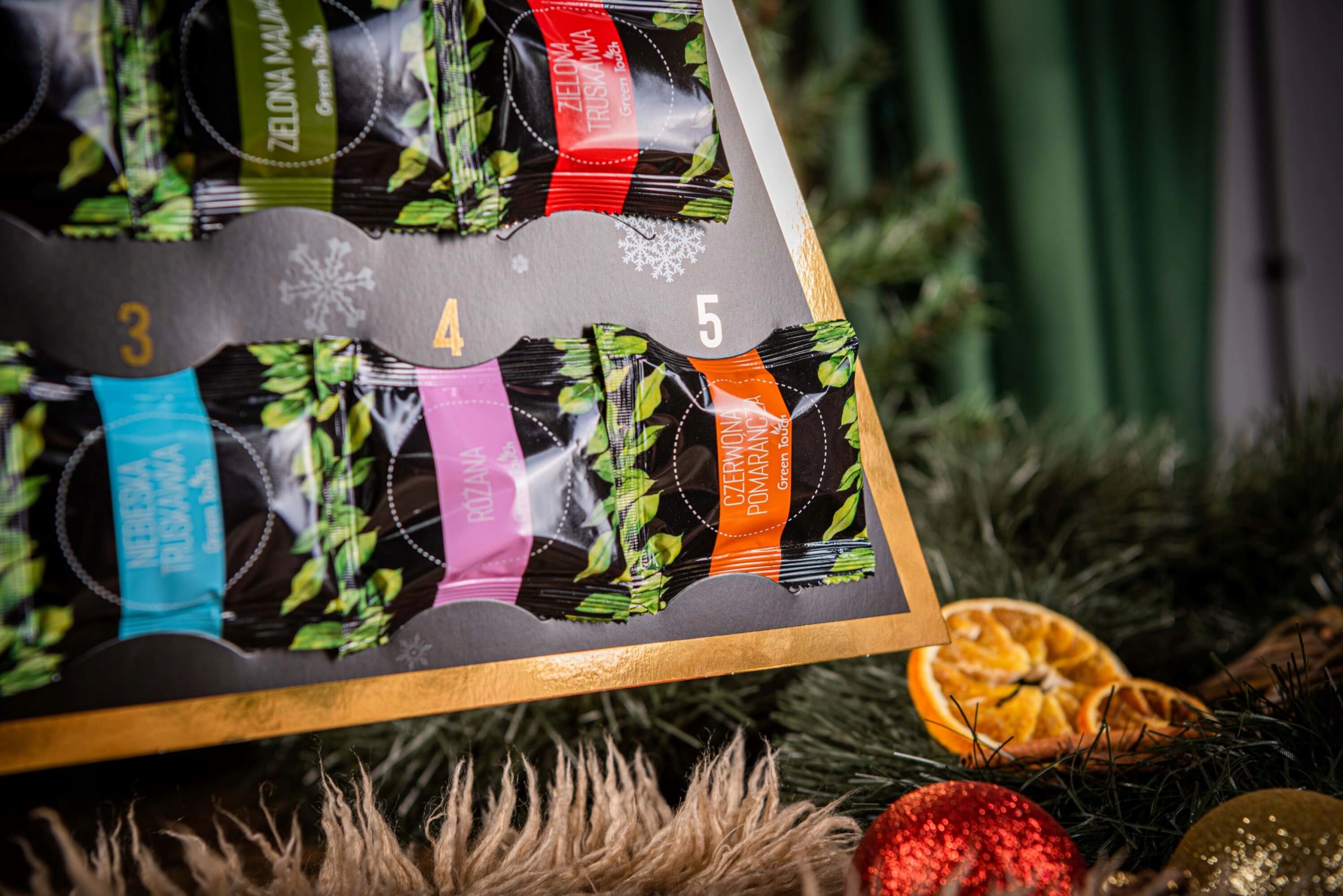Чайні пакетики розміщені на унікальному календарі у формі ялинки, виготовленому з преміального картону з двостороннім друком та спеціальними вишукуваннями.