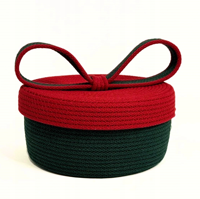 Різдвяний кошик ручної роботи з бавовняної мотузки - зелений, діаметр 20 см, висота 12 см, з червоною кришкою, прикрашеною зеленим бантом з червоною окантовкою.
