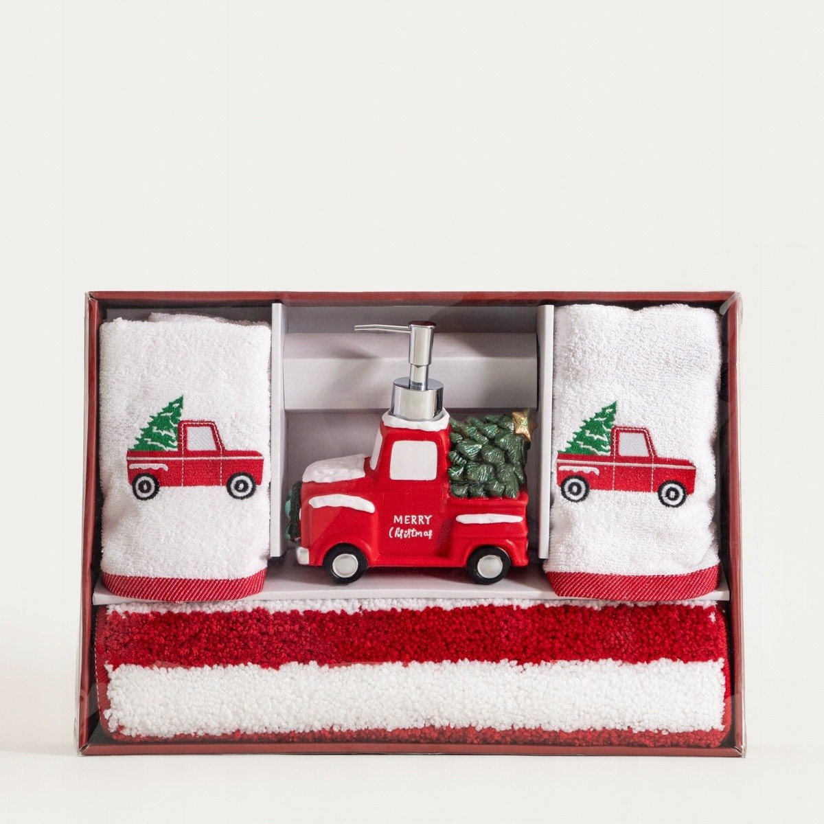 У набір входять практичні аксесуари для ванної кімнати, які будуть корисні для щоденного догляду. М’який килимок, гігроскопічні рушники та декоративний дозатор для мила – це гаджети, які обов’язково підійдуть у вашій ванній кімнаті. Аксесуари прикрашені популярним мотивом червоного автомобіля з ялинкою. Набір привнесе в будь-яку ванну кімнату веселу та святкову атмосферу.