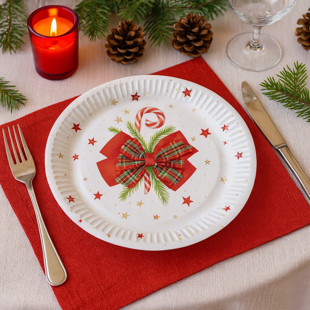 Створіть неповторну святкову атмосферу за столом за допомогою елегантного набору різдвяних паперових тарілок і чашок. Чарівний різдвяний мотив із бантиком, гілочками та льодяником створює радісну зимову атмосферу, ідеальну для Св. День Святого Миколая, Святвечір, різдвяні сімейні зустрічі та шкільні та дитячі свята.