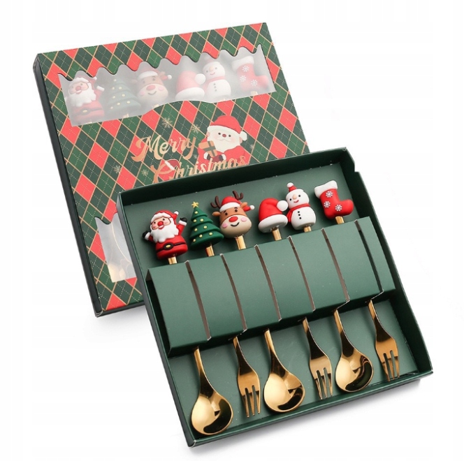 Цей золотий різдвяний набір столових приборів спеціально розроблений для святкування Різдва та свят, включаючи 3 чайні ложки та 3 виделки. Ручка прикрашена милими різдвяними персонажами, такими як Санта-Клаус і сніговики. Він підійде не лише як різдвяний подарунок, але й додасть тепла та радості вашому різдвяному обідньому столу.