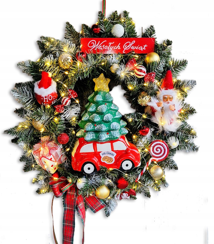 ГАРНИЙ ВІНОК В РІЗДВЯНІЙ АТМОСФЕРІ НА МАРОЖНОМУ ВІНКІ З ДЕРЕВ'ЯНОЮ ТАРИЛОЧКОЮ РУЧНОЇ РОБИ В ЦЕНТРІ A МАШИНА З ЯЛИНКОЮ ТА РІЗНИМИ ПРИКРАСАМИ. ВІНОК, ОСВІТЛЕНИЙ СВІТОДІОДНИМИ ЛАМПАМИ