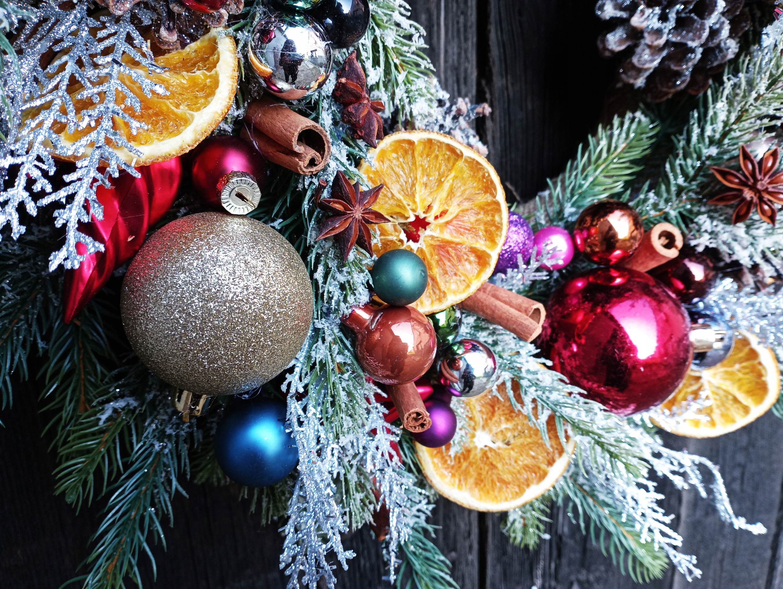 - виготовлену на основі штучних ялинових гілок ПЕ схожі на живу рослину, кольорові скляні та пластикові дрібнички, соснові шишки, сушені апельсини, ароматна кориця та аніс