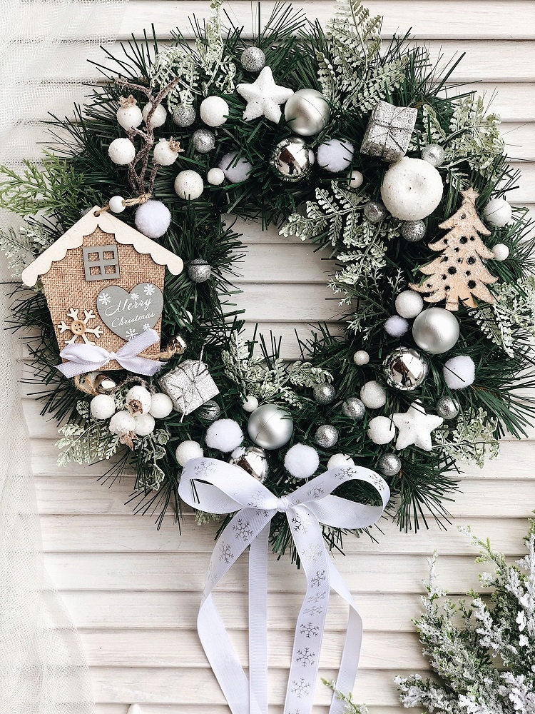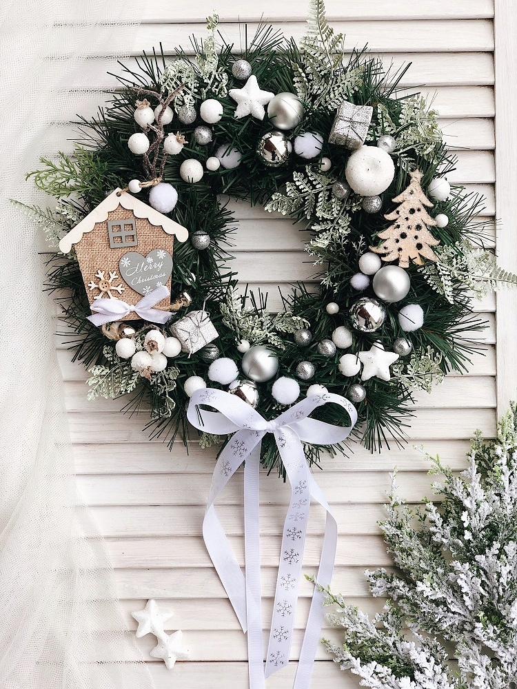 Чарівний різдвяний віночок, прикрашений кульками, подарунками, зимовими гілочками, зірочками та дерев'яним будиночком, ялинкою та бантом.