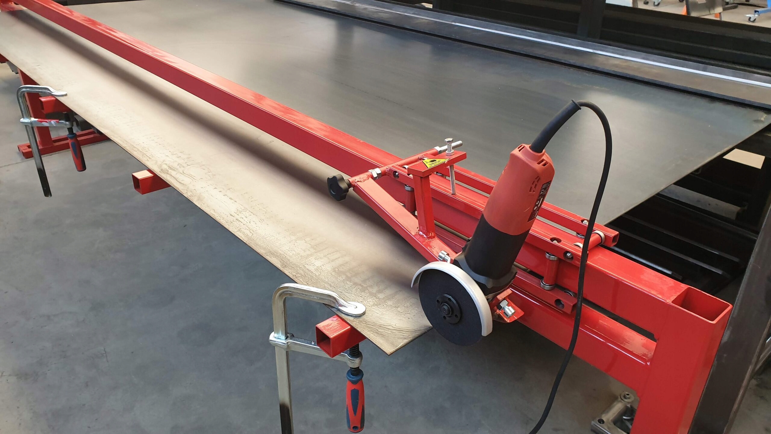 Насадка для різання листового металу до кутової шліфувальної машини призначена для простих розрізів більш товстих листів до 3000мм. Направляючий візок шліфувальної машини дозволяє прямо та рівномірно різати листовий метал.
