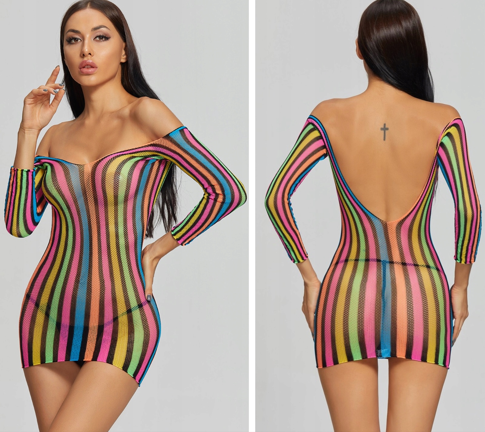 Ця різнокольорова смугаста міні-сукня з довгими рукавами є справжнім проявом модної креативності та сміливості. Ця сукня, виготовлена з легкого та дуже прозорого матеріалу, стане ідеальним вибором для моментів, коли ви хочете висловити свою індивідуальність та чуттєвість.