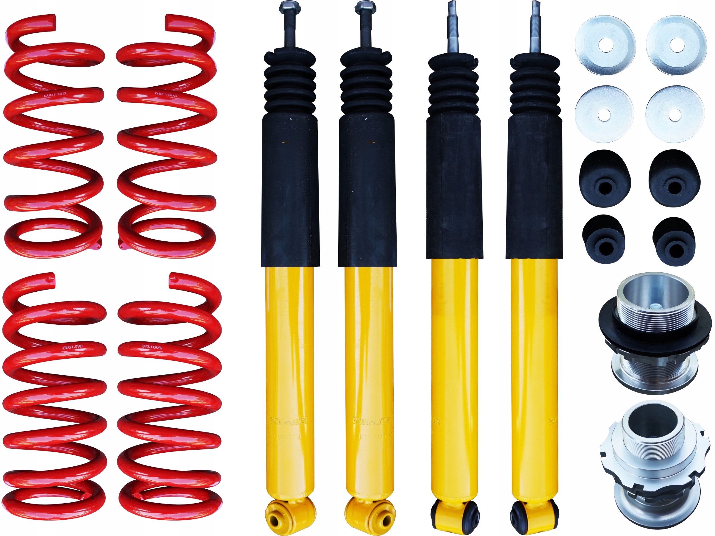 В комплекті 2 передніх амортизатора, 2 задніх амортизатора, 4 регулювальних втулки, 4 пружини, ключ для регулювання висоти та сертифікат TUV