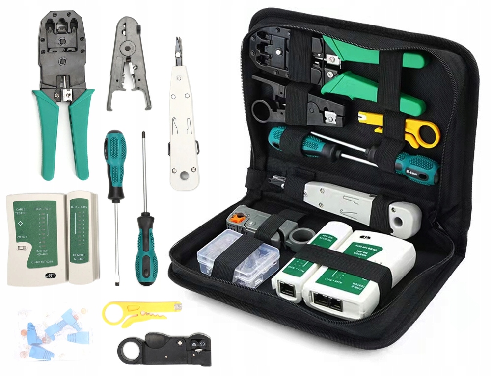 ⭐ Мережевий комплект із 9 частин, завдяки якому ми можемо перевірити та, можливо, відремонтувати мережеву установку RJ-45. Набір інструментів для обслуговування мережі включає: тестер кабелю RJ45 RJ, щипці 4/6/8 P, щипці, знімачі, плоску викрутку та хрестоподібну викрутку та 2 інструменти для різання кабелю. У наборі цілих 10 штекерів RJ 45. Все це упаковано в елегантний футляр.
