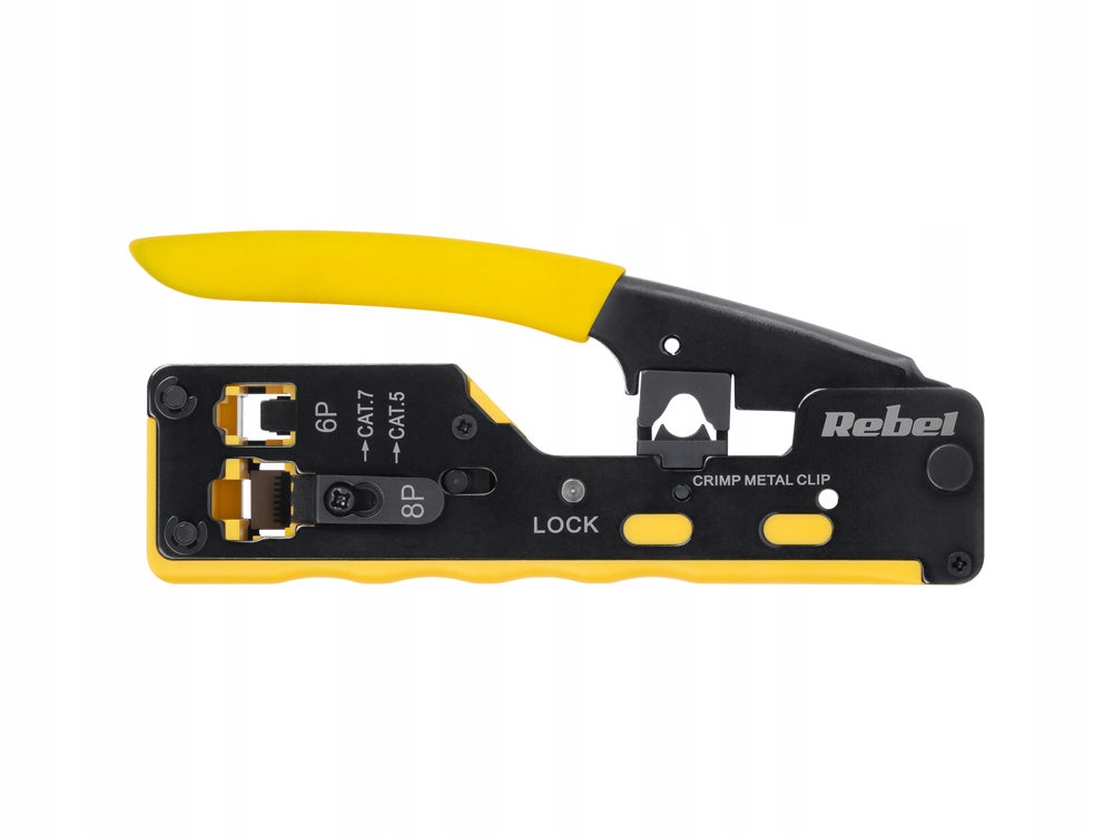Прохідний обтискач Rebel RB 1006 для модульних і прохідних штекерів типів: 8P8C/RJ45, 6P6C/RJ12, 6P4C/RJ11. Крім того, інструмент має вбудований затискач екрана. Спеціальний притискний механізм запобігає недостатньому тиску конекторів.