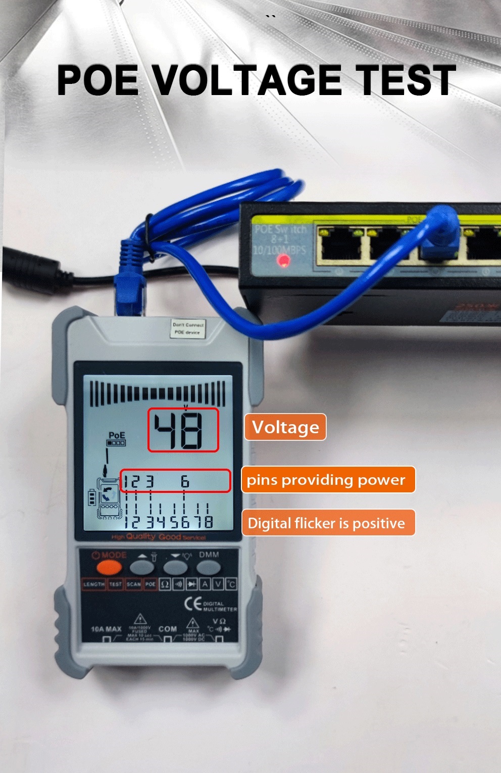 - Тест POE: Тести POE можуть перевіряти полярність відображення кабелю та напругу мережевих комутаторів POE.