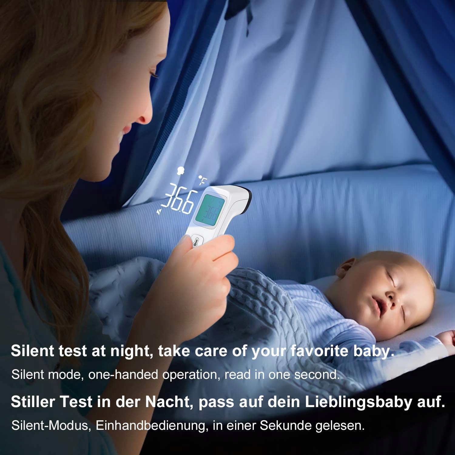 - Цифровий термометр оснащений РК -дисплеєм і оснащений трьома режимами освітлення, завдяки яким дані можна прочитати нормально вночі. Завдяки клінічному термометру для немовлят ви можете легко та безпосередньо читати дані про температуру тіла.