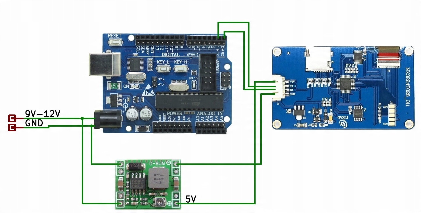 Для живлення дисплея ми вважаємо за краще використовувати спеціальний модуль FOCA або наведену нижче схему підключення.