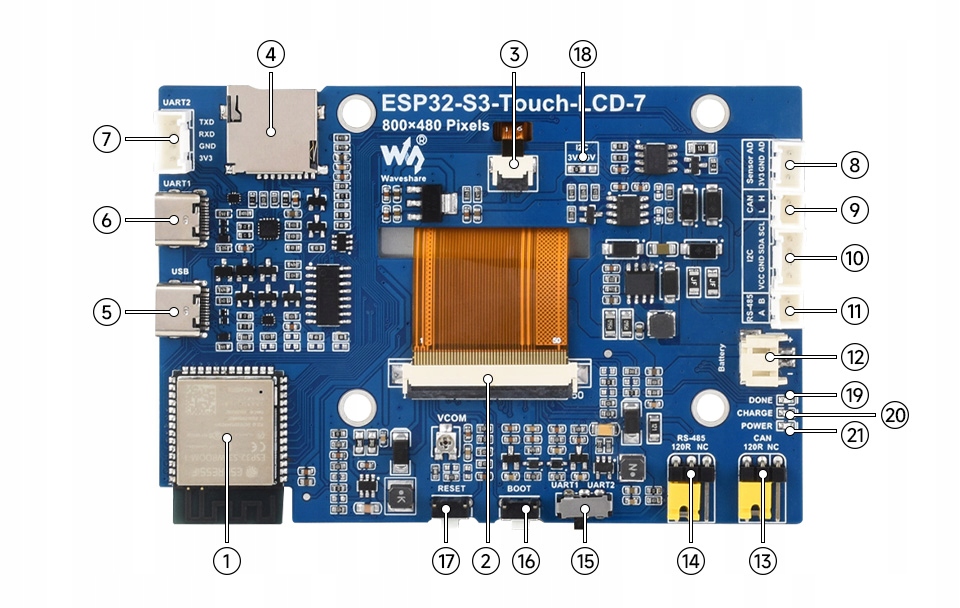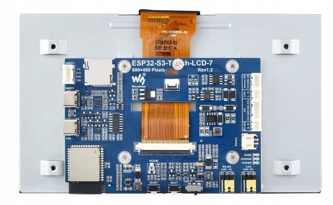 ESP32-S3-LCD-7-це ефективна табличка з розробки з 7-дюймовим екраном з роздільною здатністю 800 × 480. Оснащений Wi-Fi 2,4 ГГц, Bluetooth 5, 8 MB Flash та PSRAM, ідеально підходить для проектів IoT та HMI. Підтримки: CAN, I2C, RS485, Micro SD. Він має вбудовану систему зарядки акумулятора, USB -порти та роз'єми GPIO для датчиків та периферійних пристроїв.