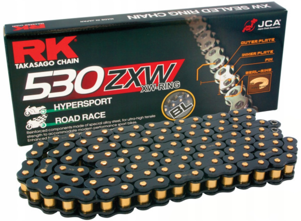ланцюги приводів мотоциклів RK виробляються однією з найвизначніших виробників японських ланцюгів RK Takasago, продукція якої у багатьох випадках переходить до першої установки в основному до японських виробничих мотоциклів. Ланцюги RK також використовуються численними гоночними командами в рангу Moto GP, Dakar та багатьох інших. В даний час RK ZXW - це найсильніший ланцюг у світі. Використовується на першій збірці у багатьох найсильніших мотоциклах. Герметизація XW-Ring гарантує продовження життя ланцюга. Стосовно урядового ланцюга він становить трохи більше 50%.
