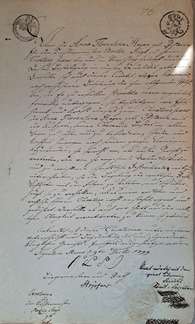 Перший документ від 8 грудня 1799 р. (документ засвідчено 9 або 19 грудня 1799 р., а оригінал занесено до книг 8 грудня 1799 р.), а другий від 26 лютого 1800 р. стосується справ Анни Флорентини Гаген, уродженої представника Пфіферіна – Мартіна Стеге, в т.ч. деталі договору між ними