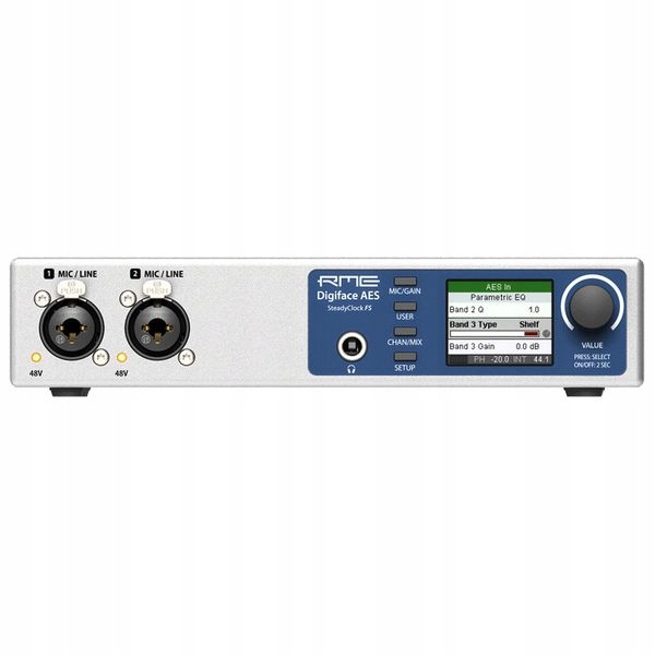 Digiface AES — це професійний інтерфейс USB 2.0 з 14 входами/16 виходами, живленням від шини, з 2 універсальними аналоговими мікрофонними/лінійними вхідними каналами та 4 аналоговими вихідними каналами (2 x XLR, один вихід для навушників TRS), що доповнює його секцію цифрових входів і виходів. Завдяки чудовому набору цифрових з’єднань, SteadyClock FS, повністю автономній роботі та вбудованому параметричному еквалайзеру, Digiface AES виділяється як ідеальне універсальне рішення для запису та відтворення цифрових і аналогових джерел, а також універсальне. відтворення/моніторинг через TotalMix FX.