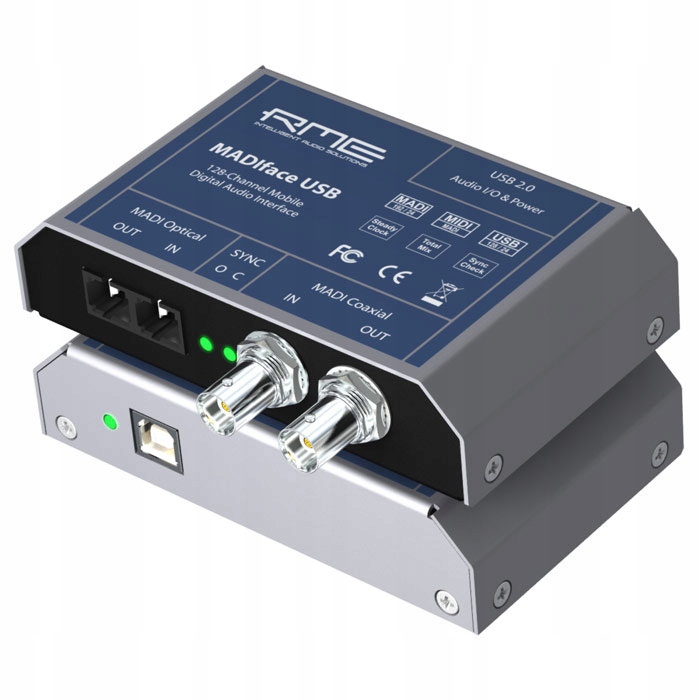 MADIface USB — це компактний інтерфейс вводу/виводу MADI, підключений через USB 2.0. Пристрій підтримує всі 64 канали формату MADI під час запису та відтворення і працює з комп'ютерами Mac і PC. Обидва входи можуть використовуватися для роботи в режимі повного резервування. Опціонально, як входи, так і виходи MADI можуть одночасно підтримувати повні 128 вхідних і вихідних каналів, які можна налаштувати через TotalMix. Коли невеликий пристрій не під’єднано до комп’ютера, він працює як унікальний двонаправлений конвертер формату та активний передавач.