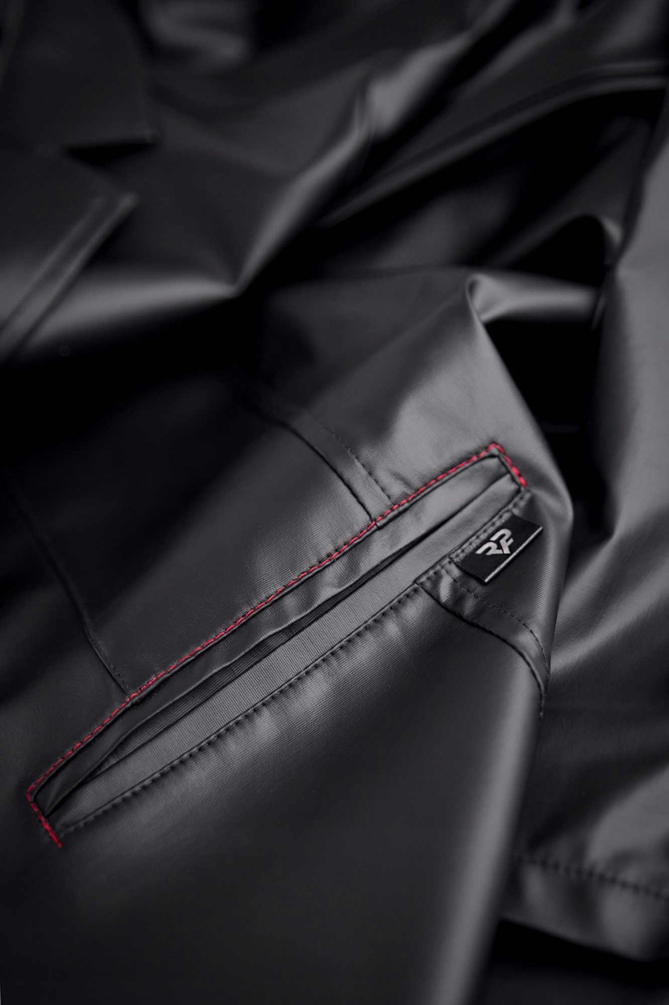 Жилет RMMarco001 вирізняється оригінальним та інноваційним підходом до офіційної класики. Це оригінальний і дуже повсякденний варіант, що відсилає до класичної форми елегантних і дуже офіційних фраків. Повністю виготовлений з високоякісного чорного, гнучкого мокрого вигляду. Завдяки властивостям матеріалу він приємний на дотик і чудово підкреслює форми фігури. Крій Slim-Fit звужує лінію талії, а розширена лінія грудей ще більше підкреслює та оголює її. На передній частині розташована декоративна срібляста кавова машина, яка знімається зверху та знизу, з привабливими підвісками з логотипом RFP. Характерний низ жилета, як спереду, так і ззаду, виділяється чіткою трикутною формою. Ефект, який справляє враження хижості та унікальності. Дві кишені з боків - дозволяють зберігати дрібниці - телефон, ключі та ін. Червона, декоративна строчка і червона алькантарова наклейка з логотипом RFP - додаткові елементи, які доводять унікальність цієї моделі