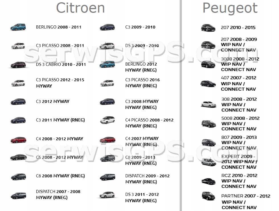 Peugeot(усі моделі з RNEG MyWay): 207 , 2008 , 307 , 308 , 308 SW , 3008 , 407 , 4007 , 508 , 5008 , 607 , 807 , Expert , Partner