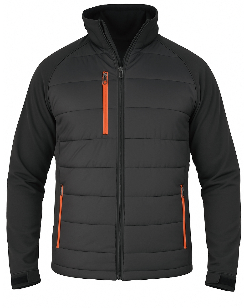 Легка гібридна куртка, створена для комфорту та універсальності. Передня частина виконана з стьобаного матеріалу з утеплювачем, який ефективно захищає від холоду та підвищує комфорт носіння при низьких температурах. Спинка і рукава виконані з еластичного софтшелу, завдяки чому куртка ідеально сидить по фігурі, забезпечує свободу рухів і ідеально підходить для повсякденних справ. Модель оснащена практичними кишенями, що застібаються на помаранчеві контрастні блискавки, що додає сучасний характер.
