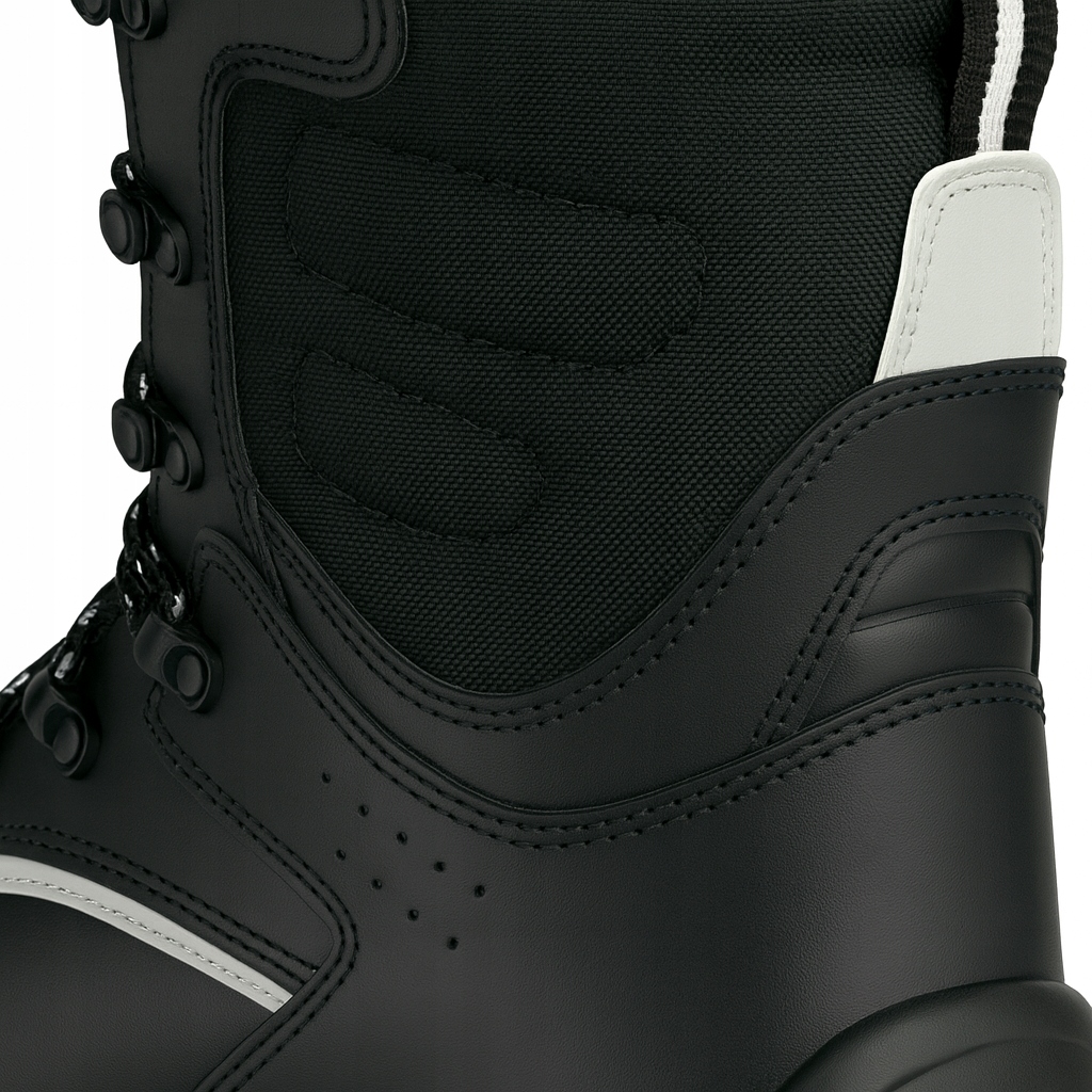Черевики ізольовані, захисні, без елементів металеві з привабливим сучасним мілітарі-вуличним дизайном, виготовлені з волов'ячої шкіри з гладким покриттям і товщиною 1,8 - 2,0 мм і просоченого, водонепроникного, дихаючого технічного полотна, утепленого спеціальною теплоізоляцією 3M. Оснащений композитним підноском, стійким до ударів з енергією 200 Дж і роздавленням до 15 кН, який легший за металевий підносок. Взуття має неметалеву антиперфораційну вставку в підошві, що захищає стопу від проколів із силою до 1100 Н.