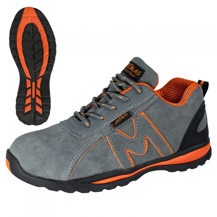Захисне взуття з привабливим спортивним дизайном, виготовлене зі спилка та замші, сірого кольору зі стильними помаранчевими аплікаціями. b>