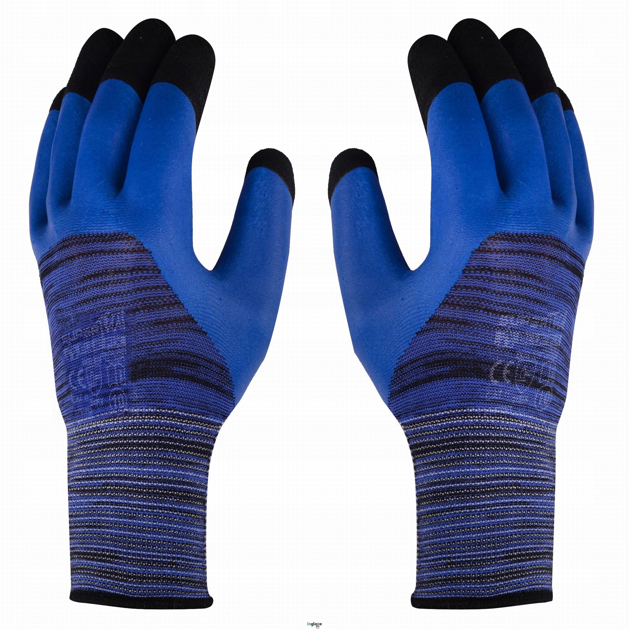 Рукавички виготовлені з міцного поліестерового трикотажу синього кольору. П'ясткові кістки покриті гладким латексом, а кінчики пальців - спіненим латексом, що гарантує хороше захоплення і відчуття утримуваних предметів, а також захищає від мозолів. Рукавички оброблені еластичною манжетою, яка приємна на дотик і ідеально адаптується до форми зап'ястя, забезпечуючи повний комфорт роботи. Крім того, вони стійкі до стирання, порізів, розривів і проколів, що гарантує їх довгий термін служби.