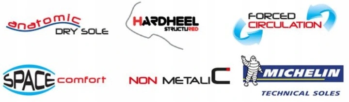 - Підошви виготовлені з комбінації спеціально розроблених гумових сумішей і створені за мотивами унікального технічного дизайну всесвітньо відомих шин Michelin®. Вони створені для будь-яких погодних умов і будь-якого середовища. Підошва повністю маслостійка, антистатична, антиковзаюча (SRC).
