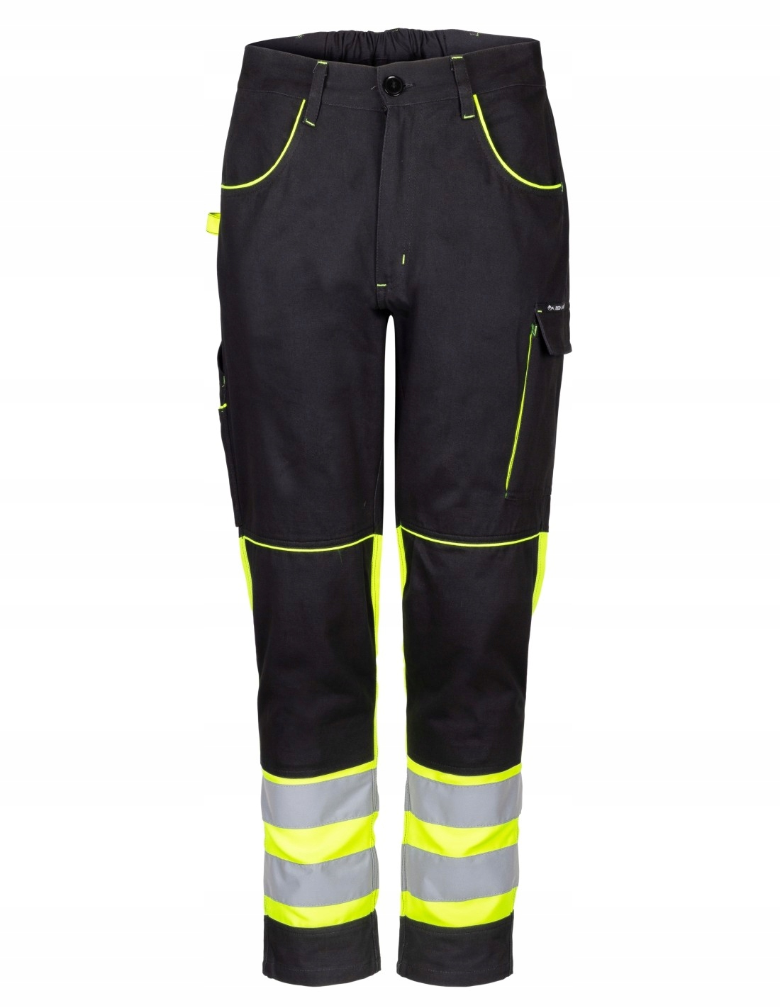 Захисні робочі штани чорного кольору без слідів з естетичними вставками жовто-селадону в просторових кишенях. Мушка на блискавці. На колінах є додаткове посилення і кишеня для наколінників. Подвійні світловідбиваючі смужки на штанинах.