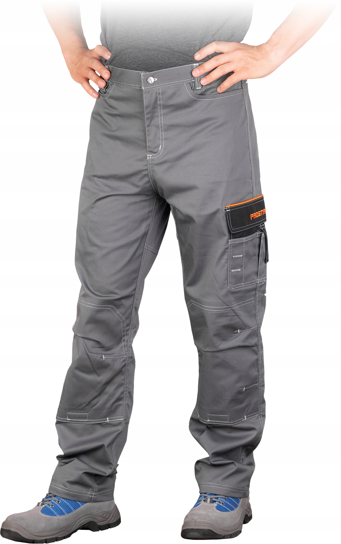 Захисні поясні штани REIS PRO MASTER PRO-STRECH-T, сталево-чорно-помаранчеві, доступні в розмірах від 46 до 60.