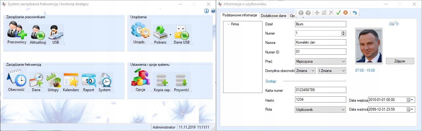 - Два методи входу в запис: читання карт RFID або зчитування відбитків пальців