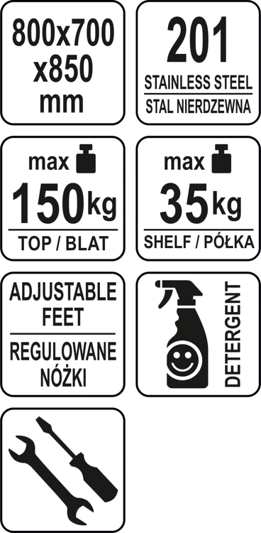 Регульований стіл з полицею виготовлено з високоякісної нержавіючої сталі SS201, адаптованої для використання в гастрономії в умовах інтенсивного використання.